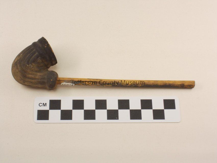 Clay pipe with wood stem. Design on pipe is incised lines.