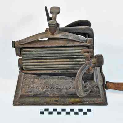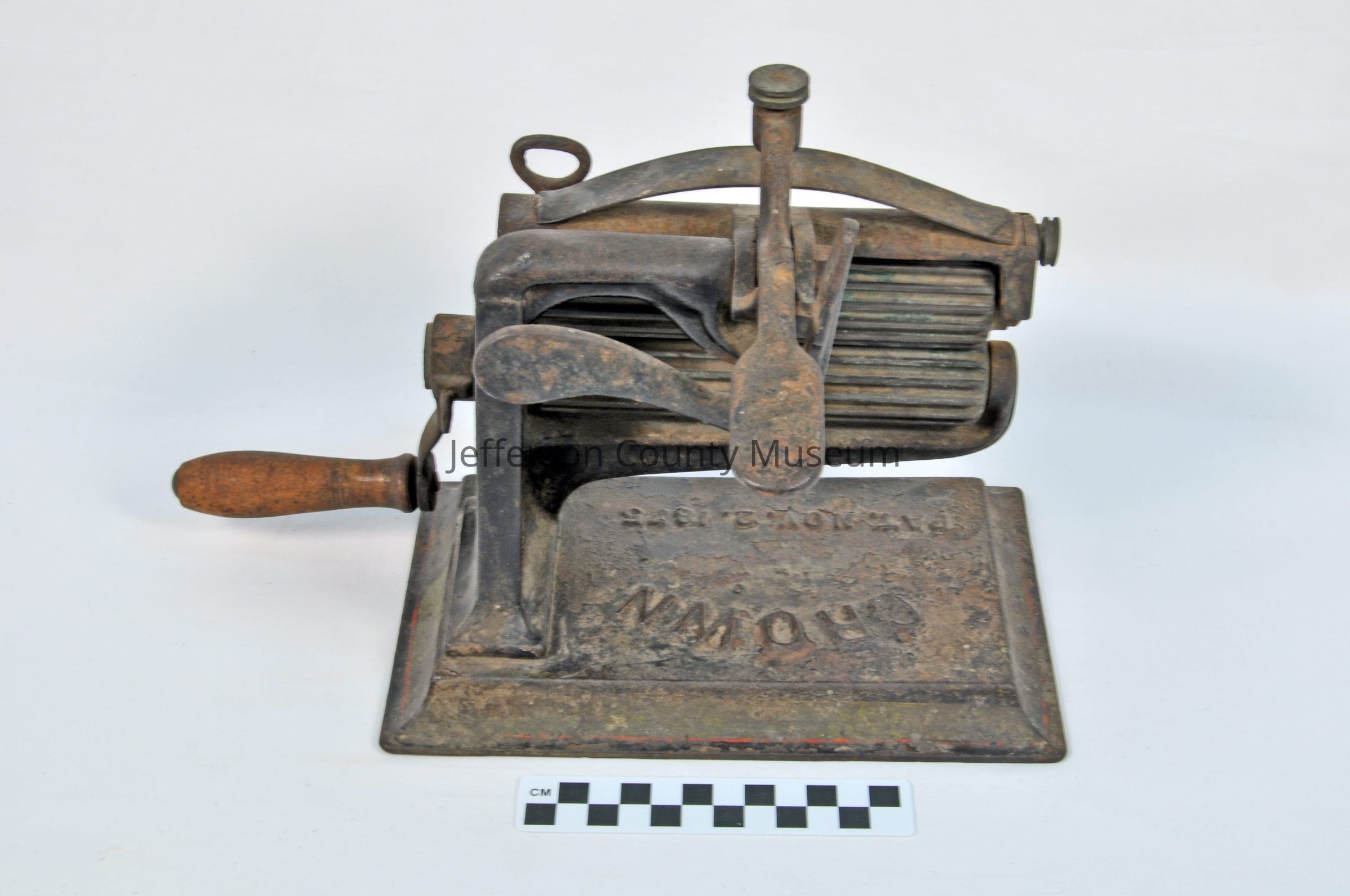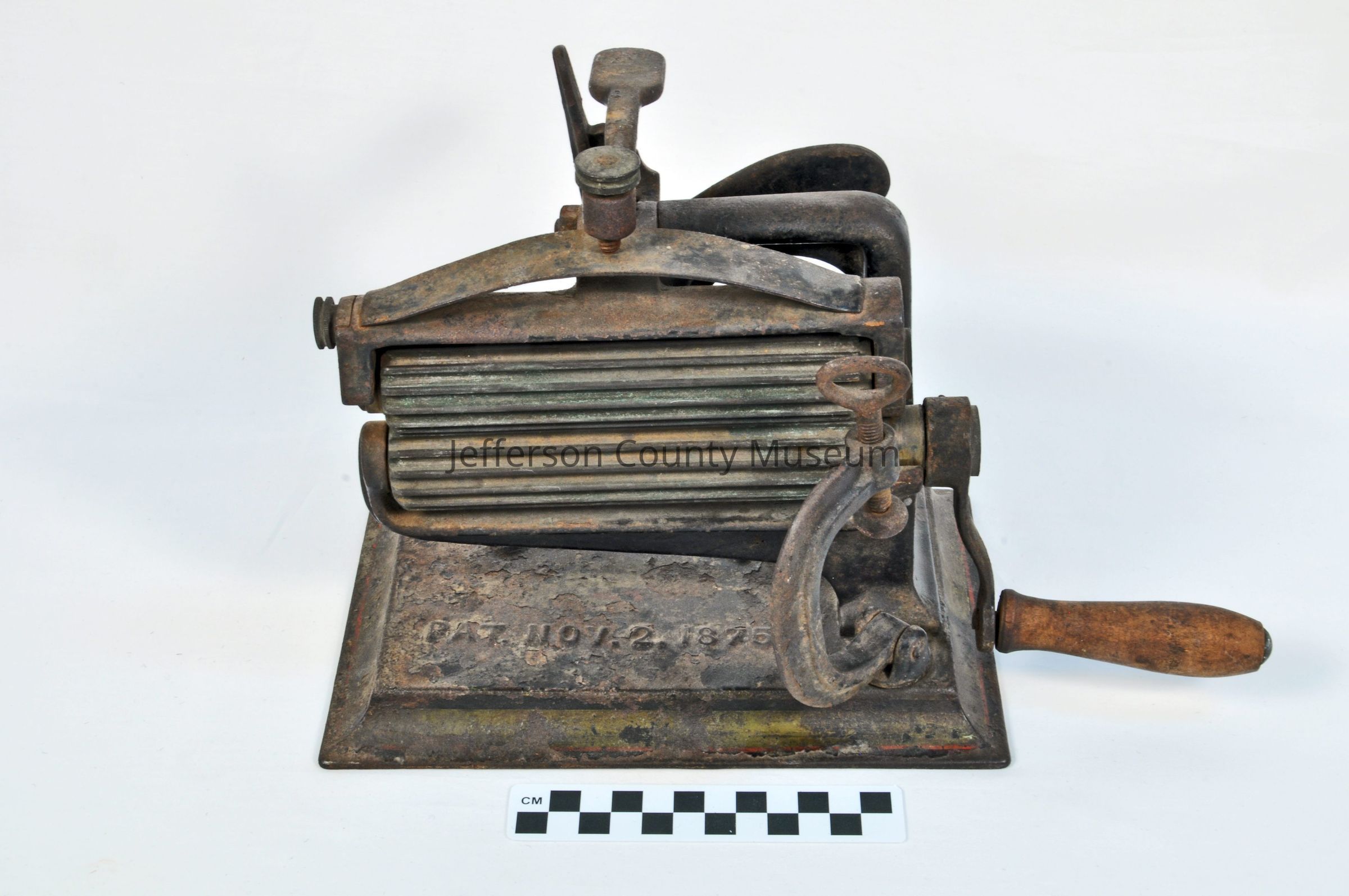 Fabric crimper with removable brass rollers. Bottom one has wood and metal handle attached. A C clamp is attached to base and there are three other handles on opposite side. Heavy metal base. Marked on base "CROWN PAT. NOV 2, 1875" Marked on underside of base "AMERICAN MACHINE CO. PHILADELPHIA, PA.".Acquisition