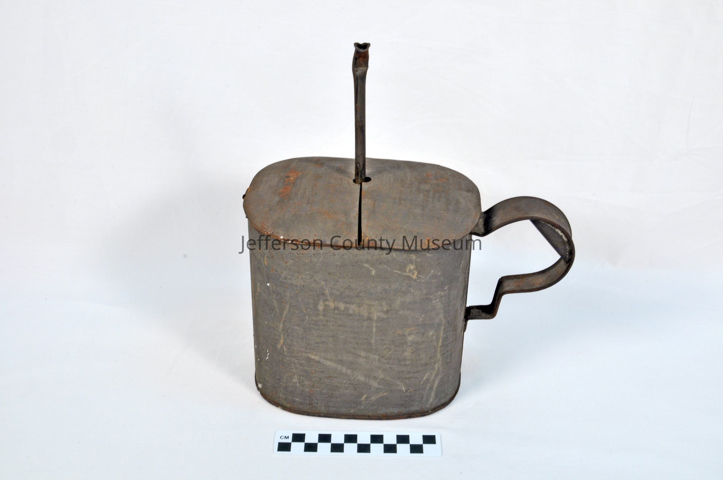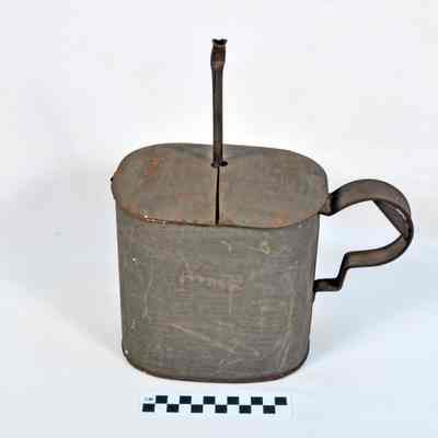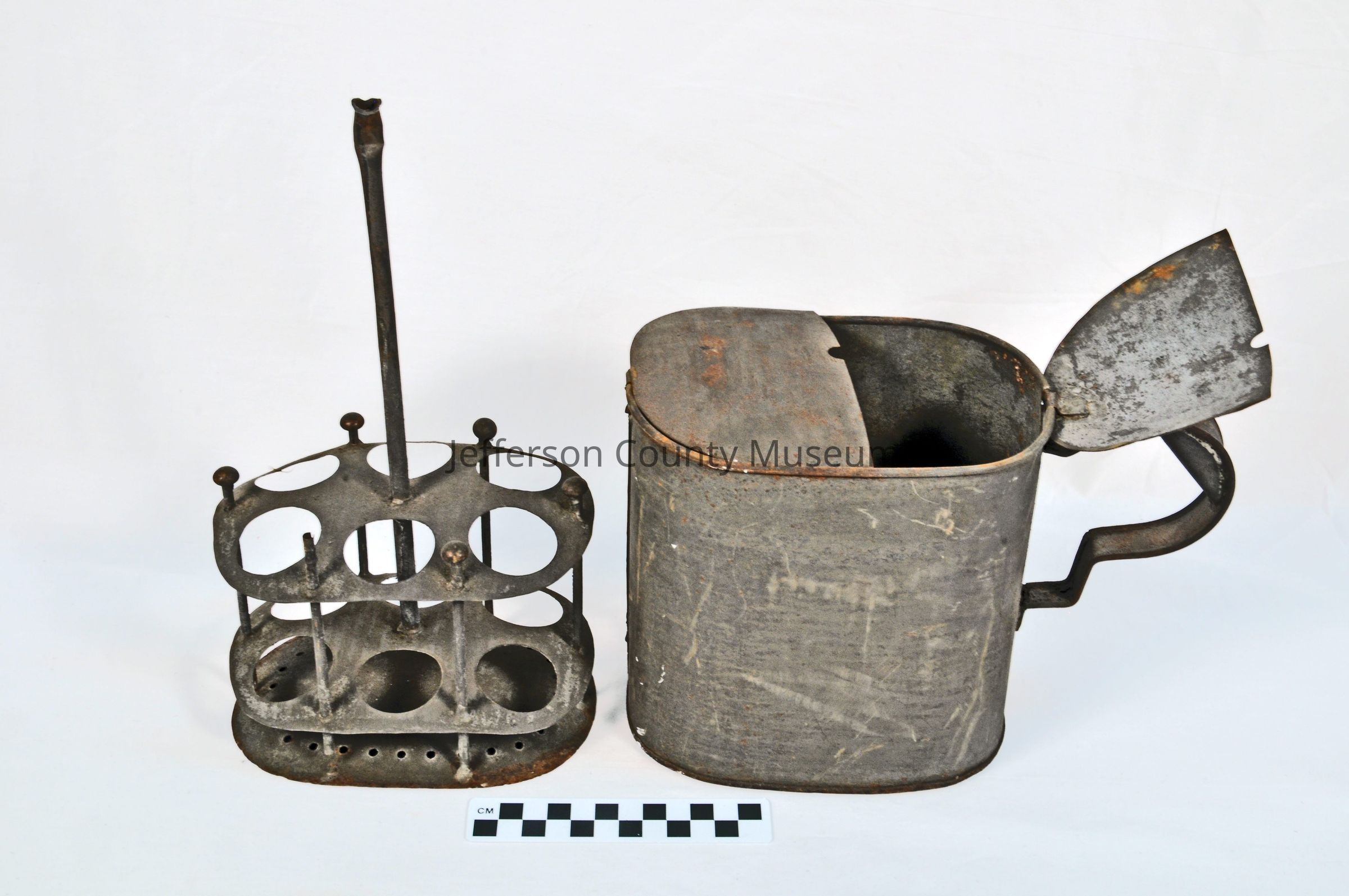 Tin boiler with handle and two lids. Lids go down from each side and fit around a steam vent from egg holder inside. The egg holder, which fits inside has holes for twelve eggs in two rows of six with small holes in bottom to allow boiling water through.Acquisition