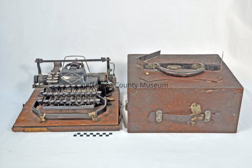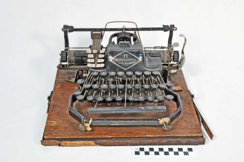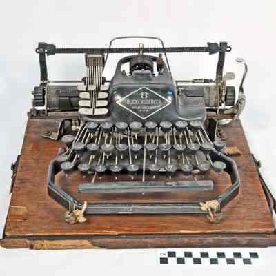 Typewriter with wheel with letters on it that struck the paper when key was pressed. Numbers are all together on left side with bright metal keys. Typewriter is mounted on wooden base and has wood cover with handle which has become detached. One leather handle attached to side of lid. Paper label inside lid with instructions for cleaning. Label on front "8 BLICKENSDERFER STAMFORD, CONN. U.S.A.".Acquisition
