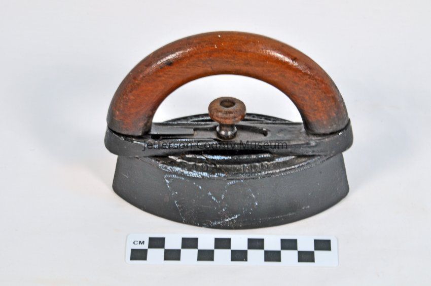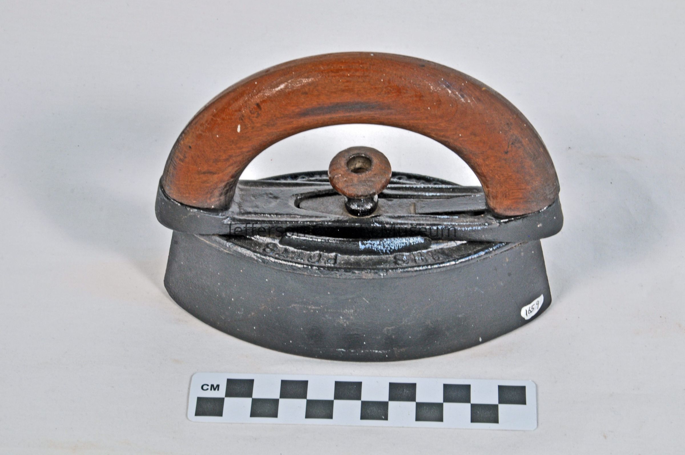 Flat iron with half-circle shaped, detachable wooden handle. Handle has wooden knob for detaching. Embossed on top of iron "MRS POTTS SAD IRON".Acquisition