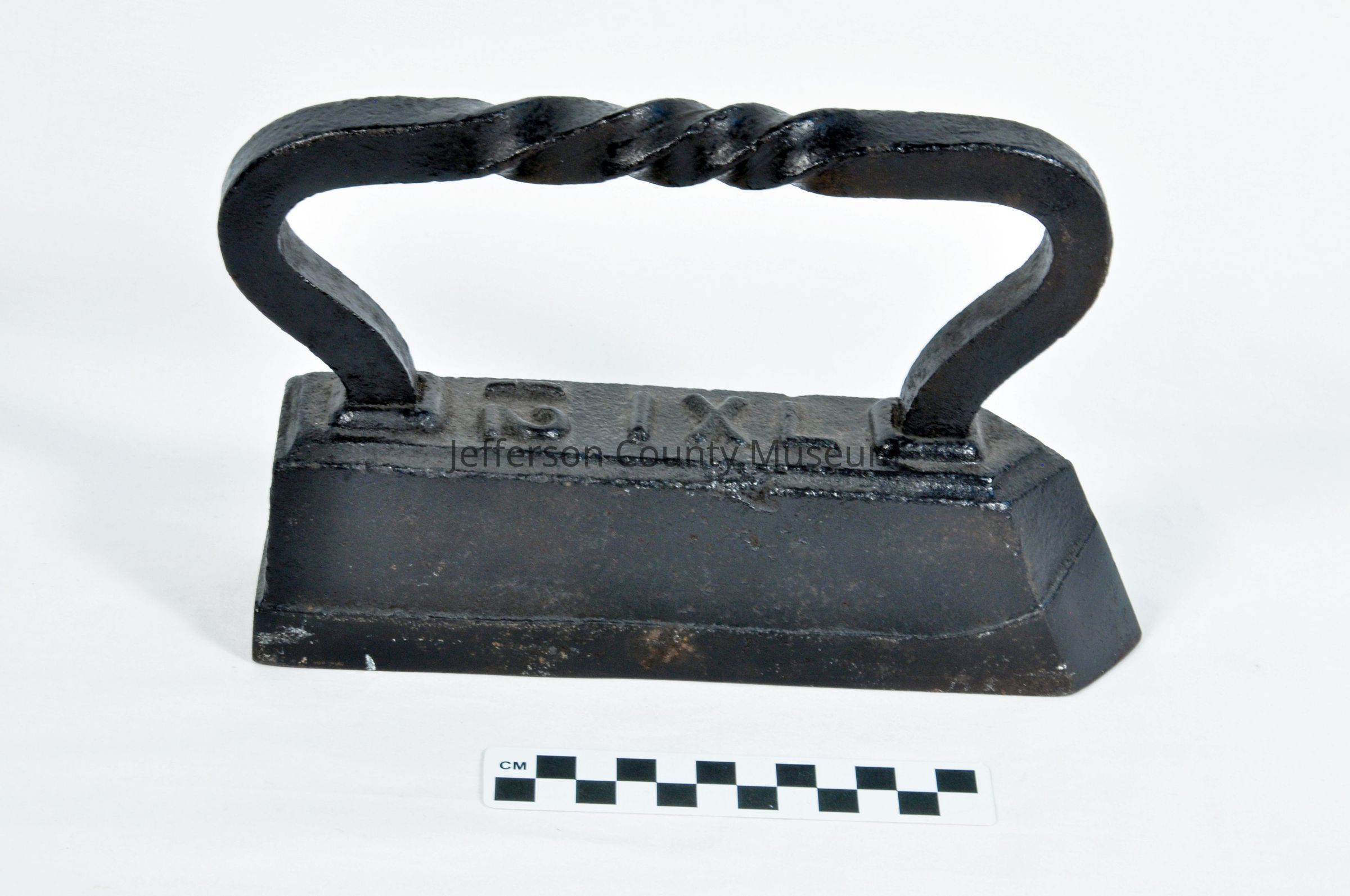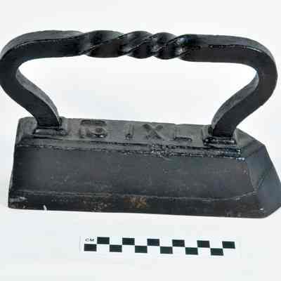 Heavy flat iron. Tag on it from Thornton Perry says "Tailor's Goose". The large handle is twisted three times at the grip. Embossed on top "12 IXL". According to former curator Sue Collins, it was used for pressing woolens.Acquisition