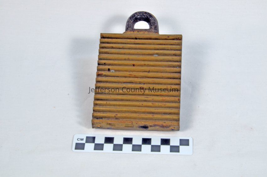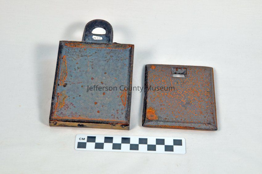 Two bottom pieces of crimping iron. Top piece is missing. The bottom pieces consist of a flat heavy iron piece that fits into the bottom half of the crimper to keep it warm. The other piece is the bottom half of the actual crimper which is a piece of iron covered with a piece of brass sheet. This piece has a small handle with the word "NORTON'S" embossed on it. 1165a is the base. 1165b sits atop 1165a. The piece that is missing would roll across the fluting to warm the handheld instrument that crimps the hair.Acquisition