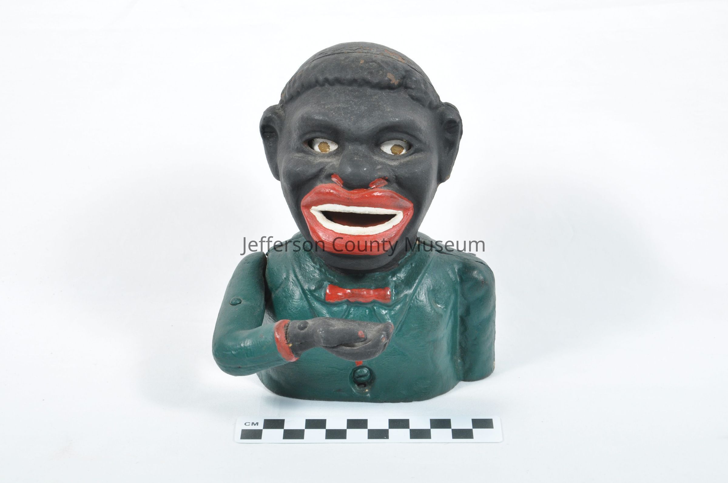 Cast iron mechanical bank painted black, green, red and white to portray an African American in a racist manner. Bank has a right hand and arm. When a lever in back is pushed down a coin is flipped into open mouth. Embossed on back is "JOLLY NIGGER BANK". Patent date is illegible. Embossed on bottom is "MADE BY SHEPARD HARDWARE CO." City is partially illegible but may be "BUFFALO". Reflects racist stereotypes of Jim Crow era.Acquisition