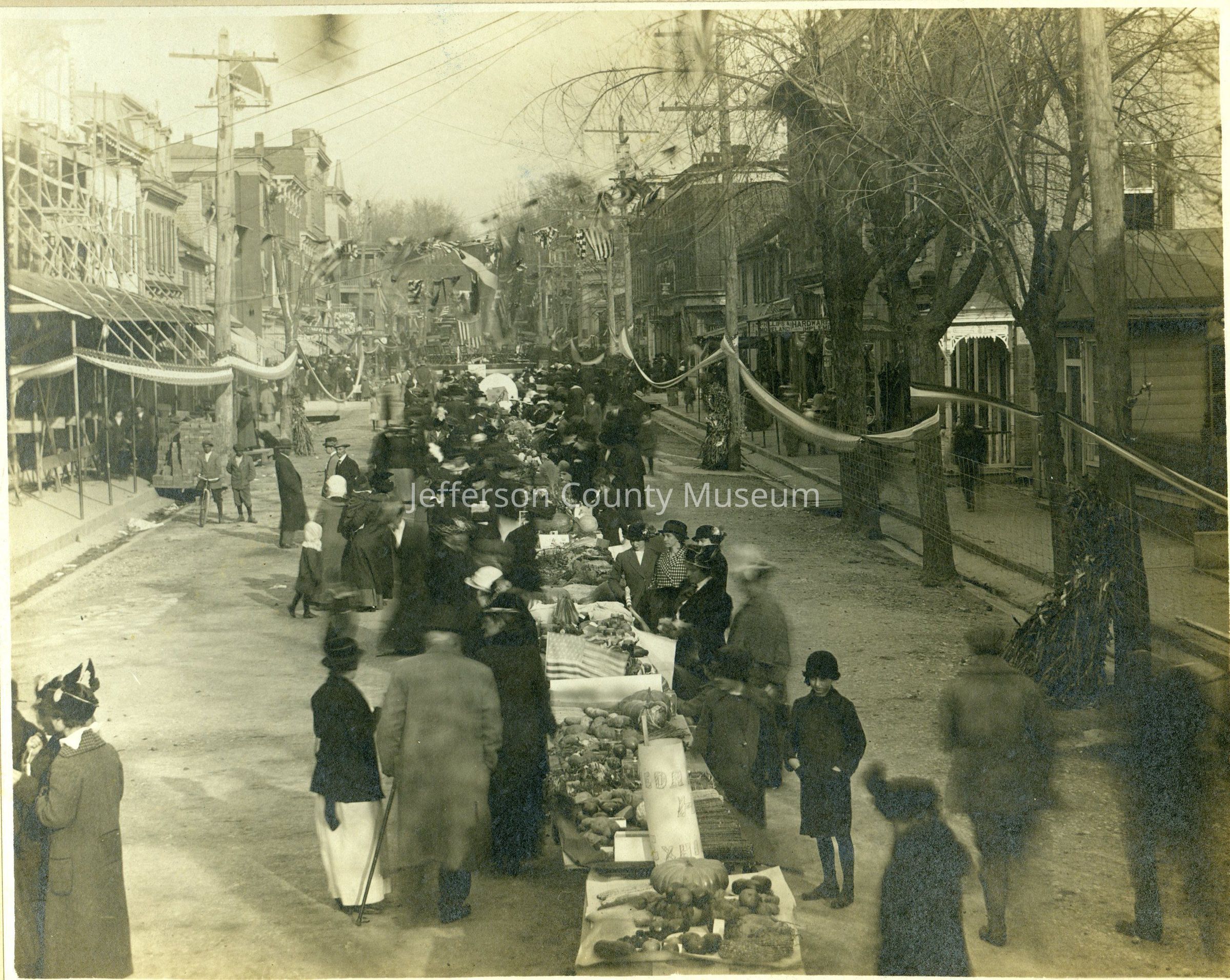 According to a Facebook commenter, the building on the left was formerly J. J. Newberry 5 and 10 cent store. The large brick building on the right side of the street with the diagonal entrance is the Trapnell Building. The trade sign (mortar and pestle) of a drug store can be seen on the building. The Brown & Hooff Drug Store occupied the Trapnell Building from 1893 until 1925 when the business was sold to Jerry White who changed the name of the business to Scott & White. In 1937 Scott & White moved to the Beverly Flats Building (currently, as of 10/2/17 the home of Abolitionist Ale Works). According to the Facebook commenter, the occasion of the photo is the "Harvest Festival" which was the precursor to the Jefferson County Fair. The Harvest Festival was held annually on Washington Street.Acquisition