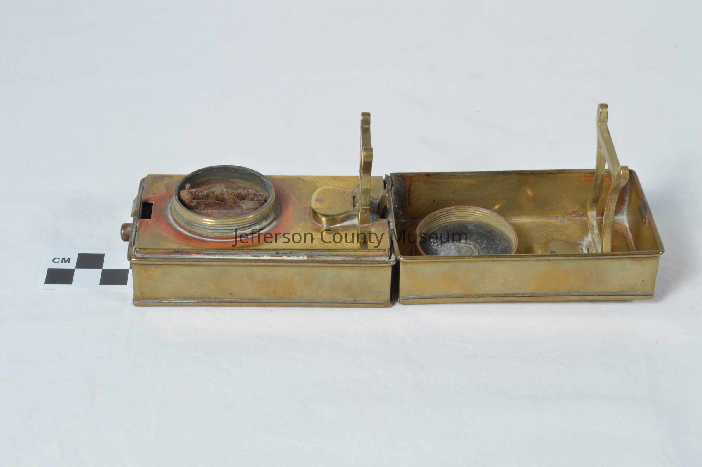 Brass box when opened has two foldable rests for a hair curling iron. There is a round screw-top lid when removed has a wick to heat the curling iron.Acquisition