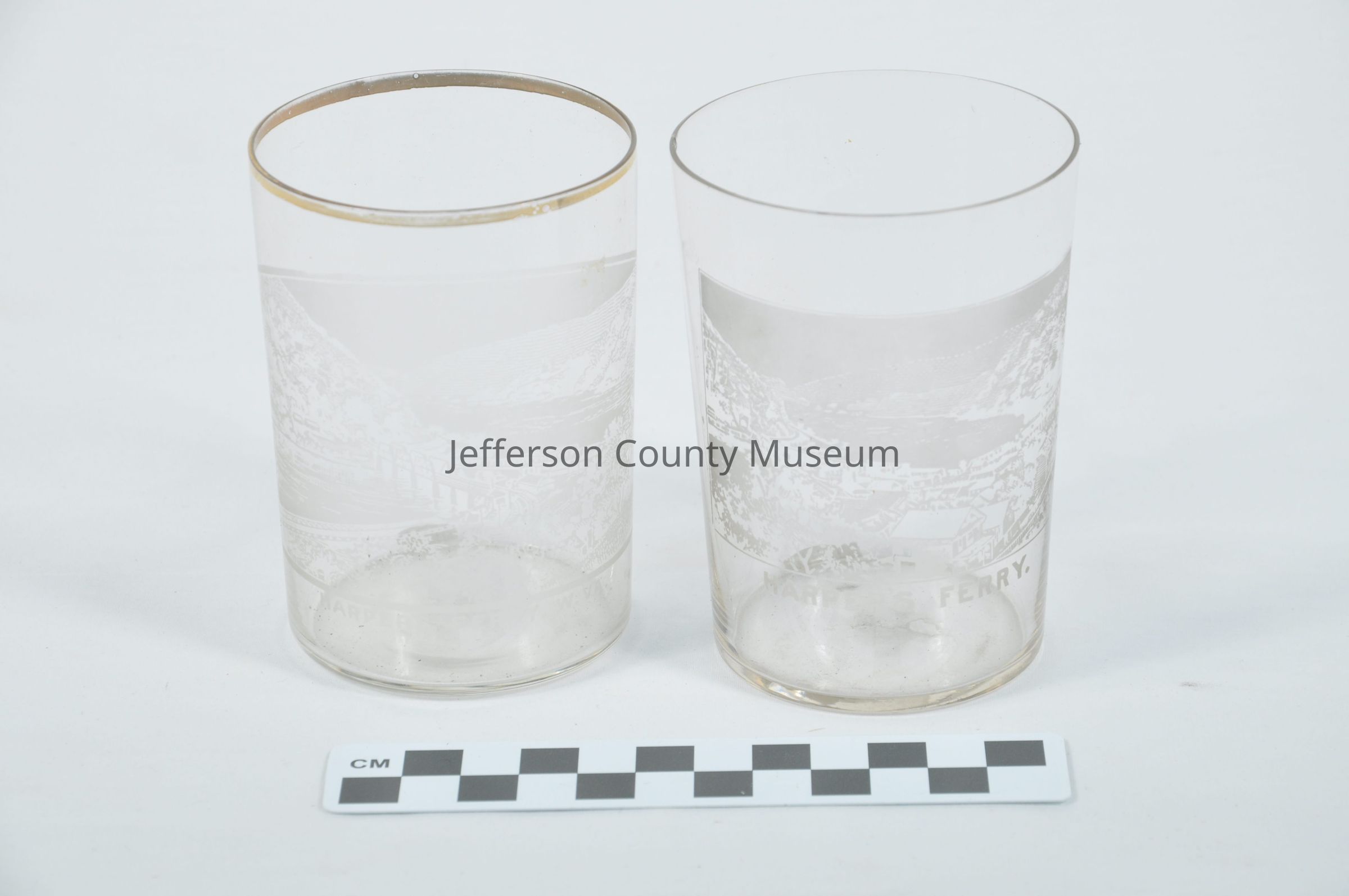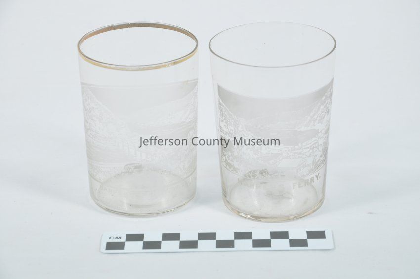 Pair of juice glasses with view of Harpers Ferry showing Potomac River and bridges (a and b). Glass a has gold rim.Acquisition