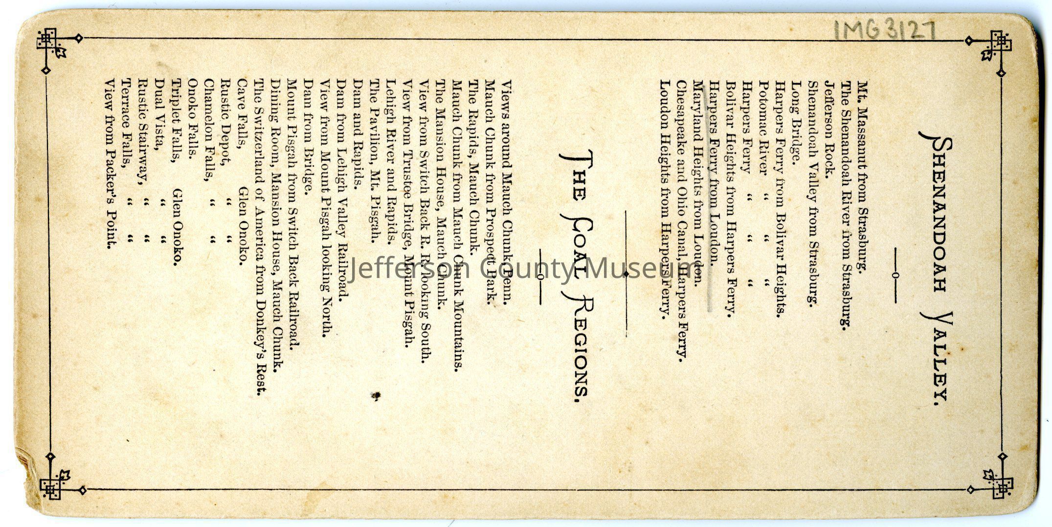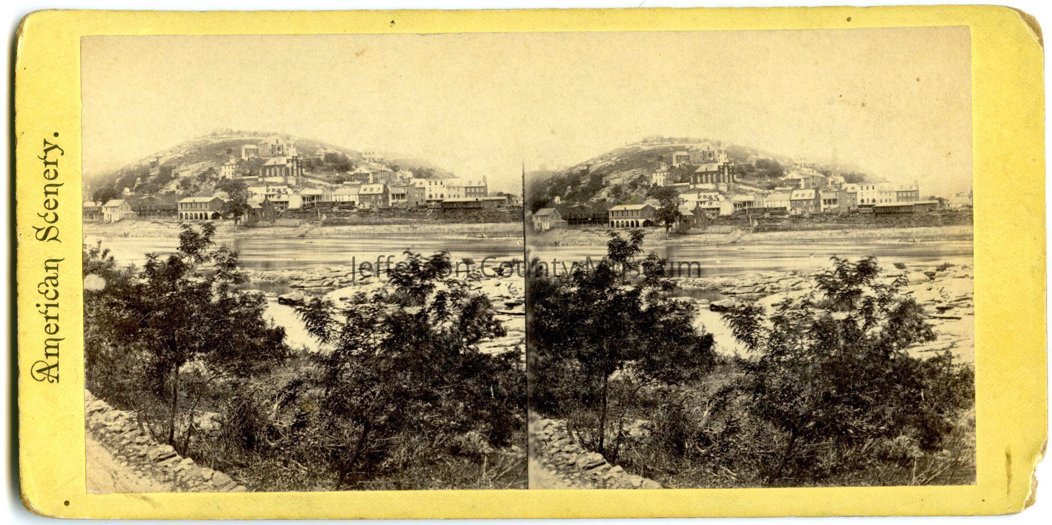 View of a hillside town in Harper's Ferry, W. Va. from across the river in Loudon. Names of the different stereographs created by America Scenery are listed on this back, grouped by two regions: the Shenandoah Valley and the Coal Regions.Acquisition