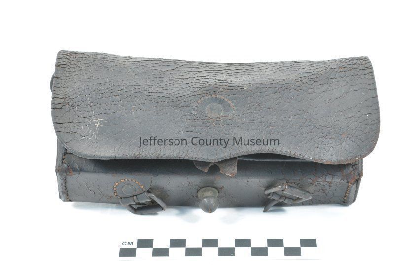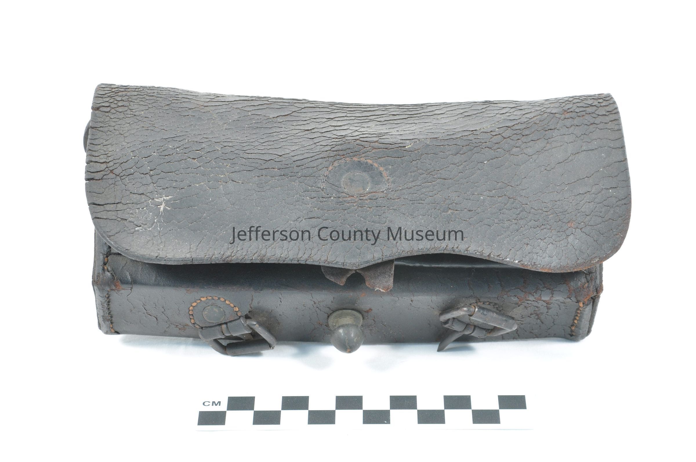 Leather cartridge box with three flaps. Inside is wooden insert with holes for twenty cartridges. On back are two belt loops. Bottom of box has two buckles and a large brass knob for closing the main flap.Acquisition
