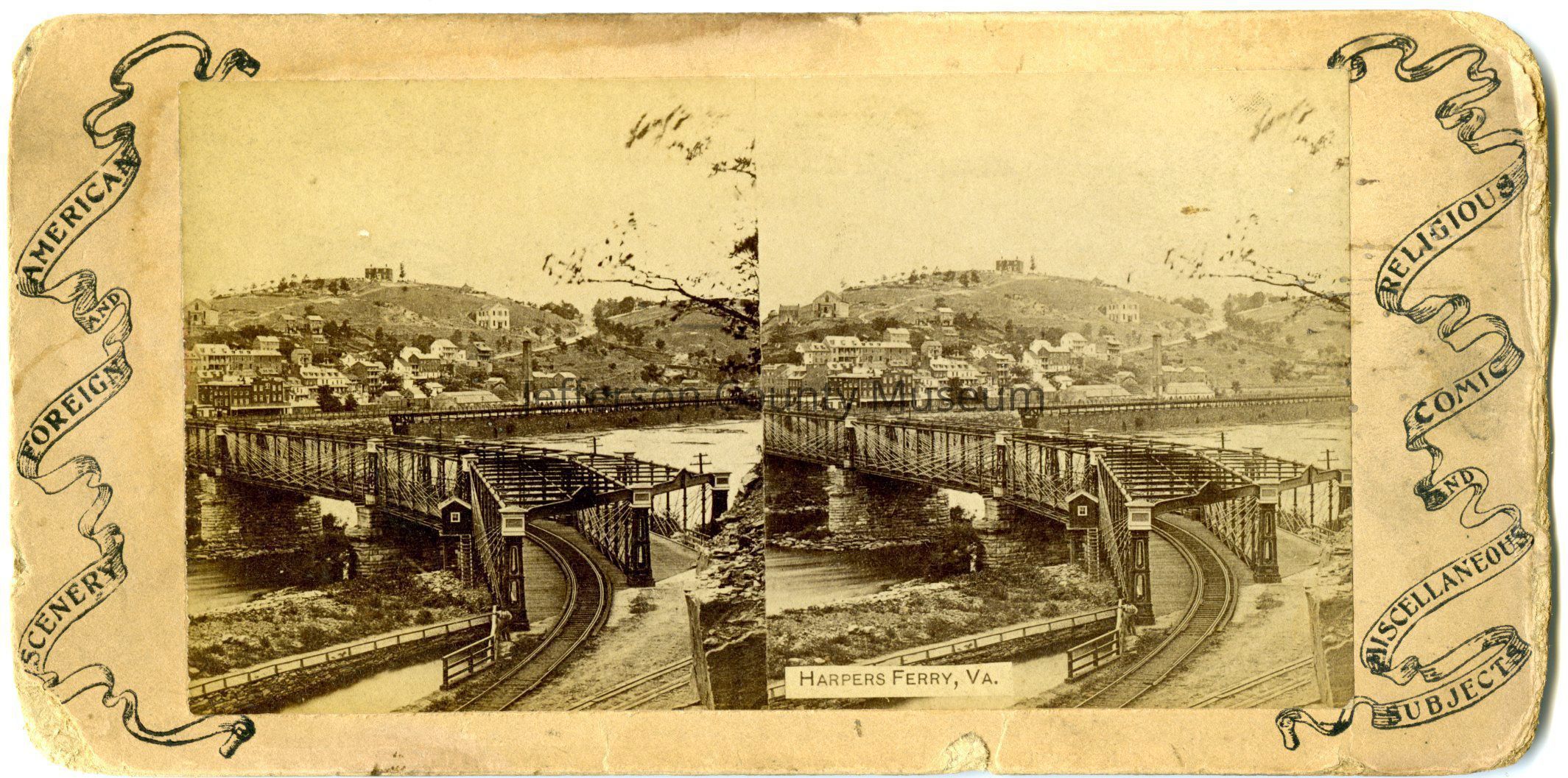 Looking over the hillside town of Harpers Ferry, as well as the railroad bridge and Potomac River. There are hand-drawn ribbon with text inside, that reads "American and Foreign Scenery. Religious, Comic, and Miscellaneous Subjects". It is possible that this is the publishing company's name and slogan.Acquisition