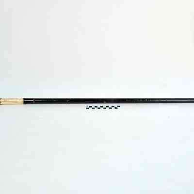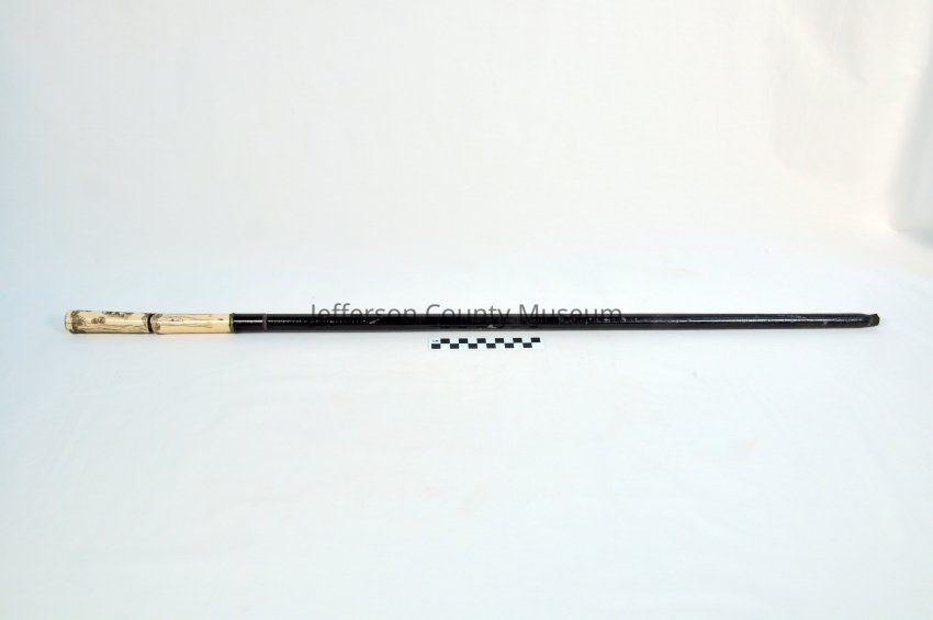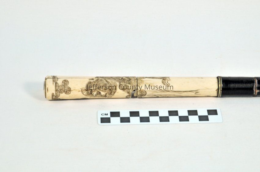 Round cane with ivory handle and short sword blade made like a wooden walking cane. Handle is scrimshawed with a monkey, tree and flowers.Acquisition
