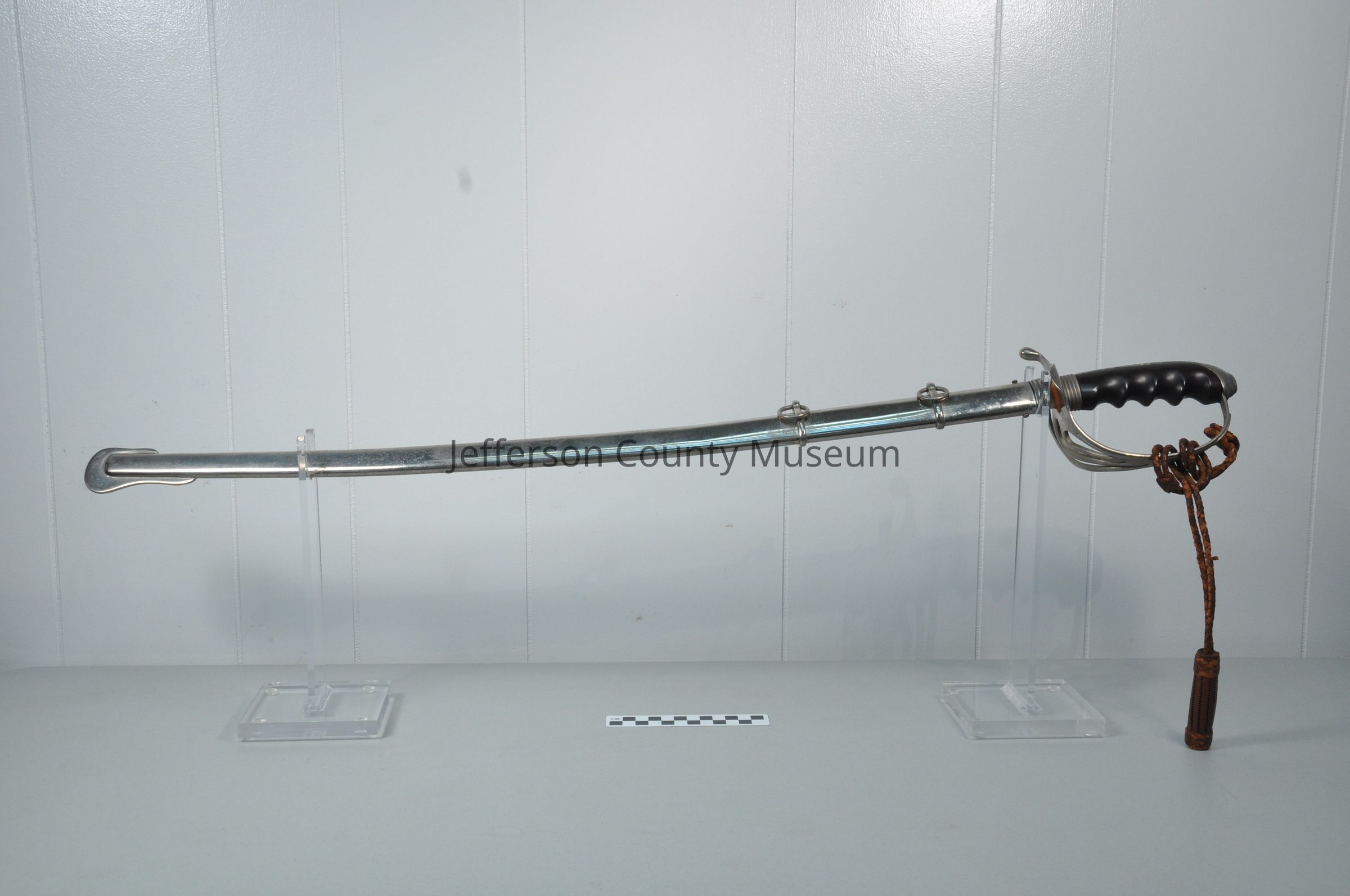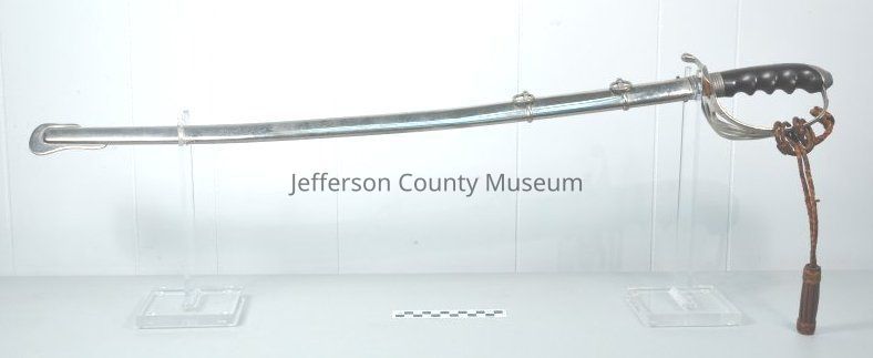Officer's sword with scabbard, possibly World War II era dress sword. Metal is bright on blade and scabbard. Handle is wood with bright metal hand guard with leather lanyard or frog attached to hand guard. Ornate etching on both sides of blade. One side of blade has "US" and other side has a spread-winged eagle with E PLURIBUS UNUM on a banner below it. Near hand guard on one side of blade is a star that looks like a Star of David but is not with "PROVED" in a circle. On other side near hand guard is "U.S. ARMY REGULATION STANDARD AMERICAN MADE". Scabbard has two metal rings.Acquisition