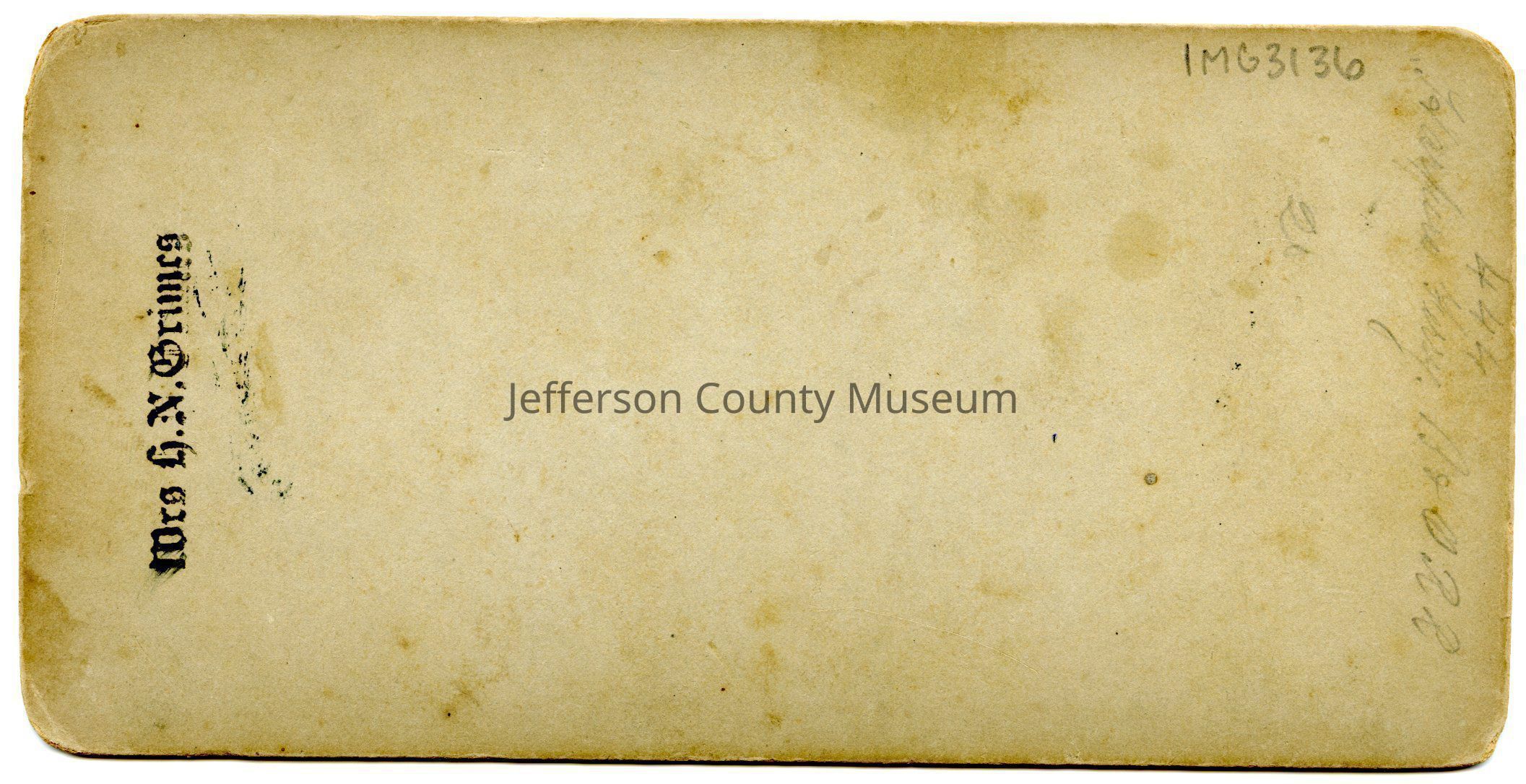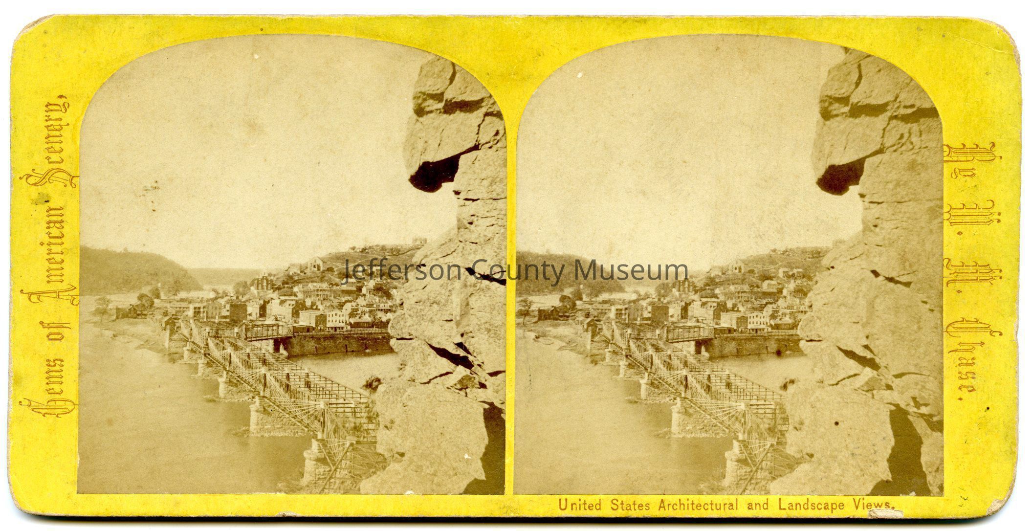 Overhead view of the Bollman Iron Bridge in Harper's Ferry and the hillside town. On the back side, the name "Mrs. h. N. Grimes" is printed.Acquisition