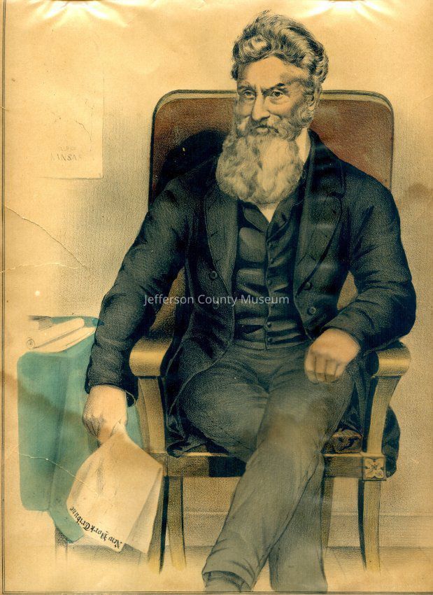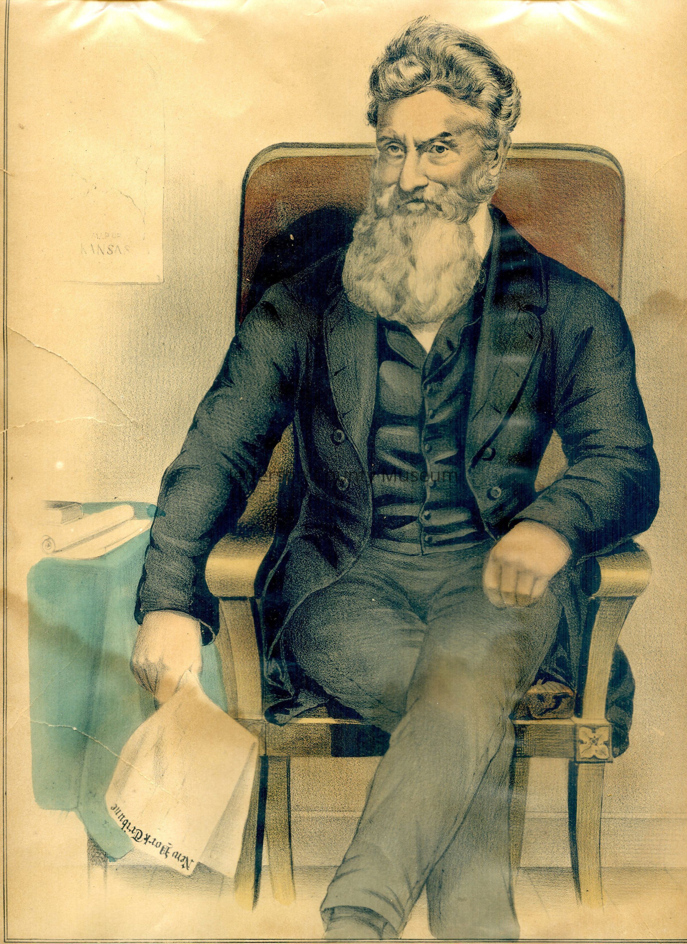 Titled at bottom " JOHN BROWN. LEADER OF THE HARPER'S FERRY INSURRECTION ." Litho. is by E.B. & E.C. Kellogg, Hartford, Conn. Shows Brown with long beard, seated with left leg over right holding a New York Tribune in his right hand. Map of Kansas behind him to right. Table covered with blue cloth and documents to his right.Acquisition