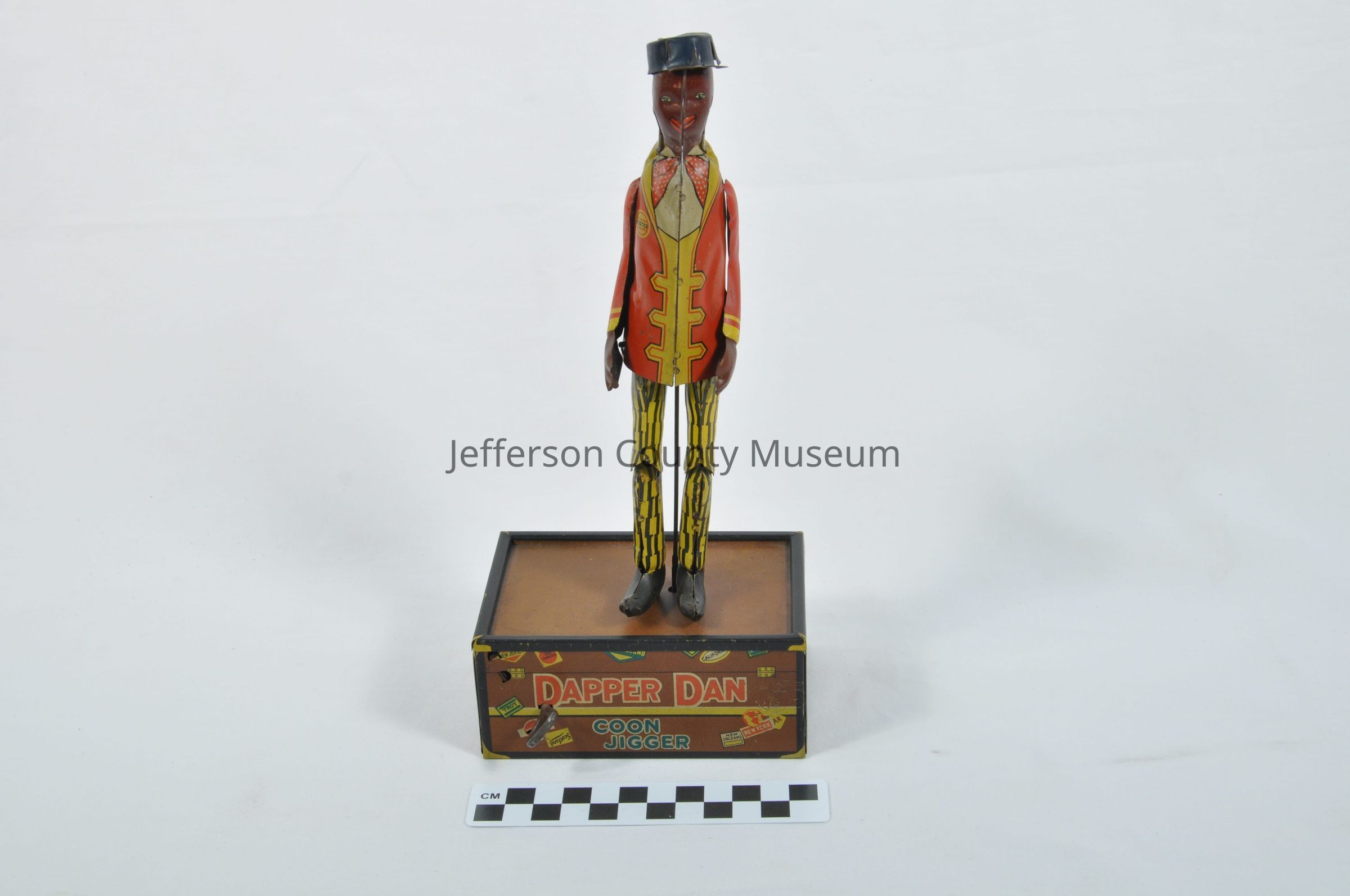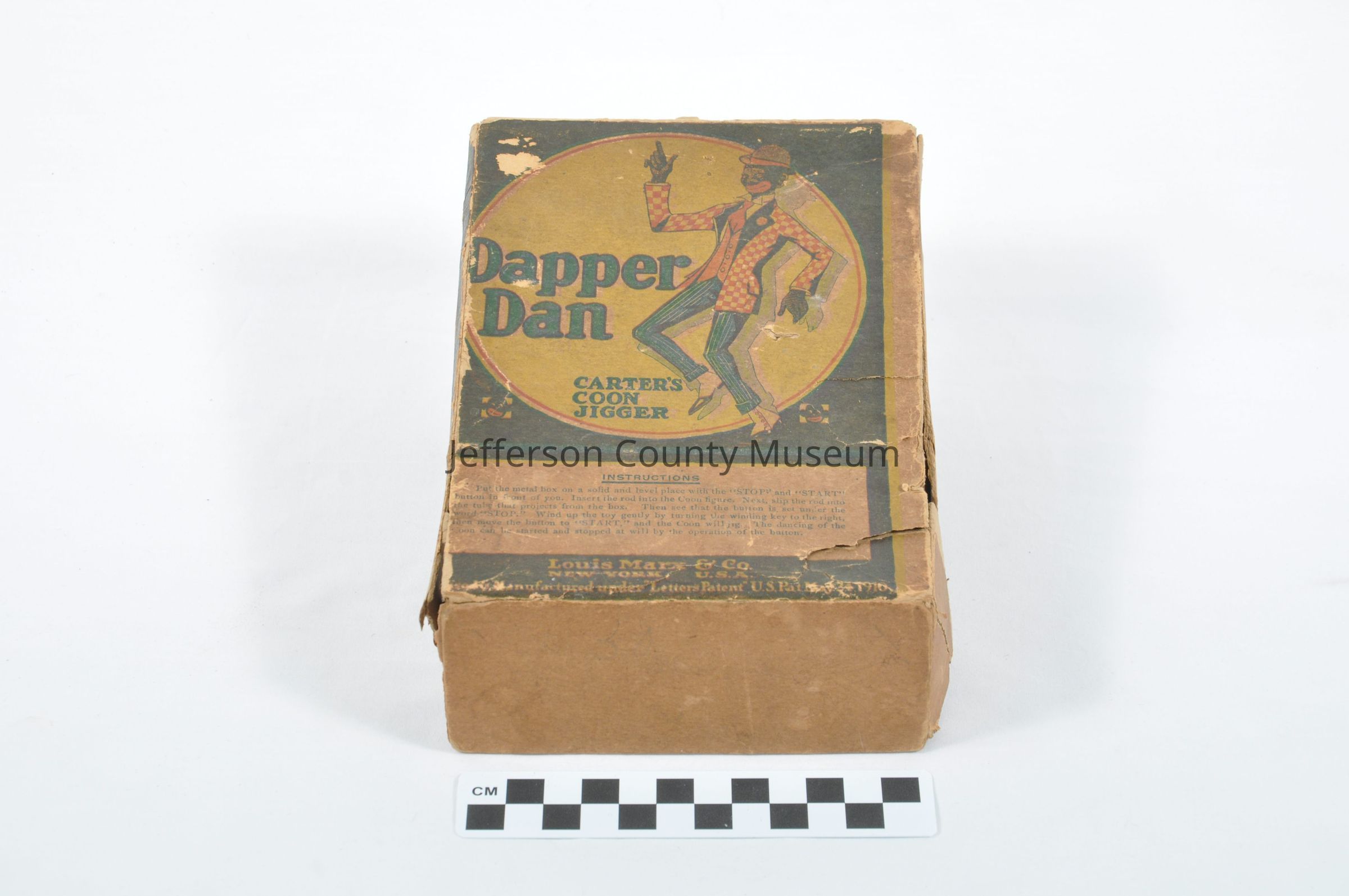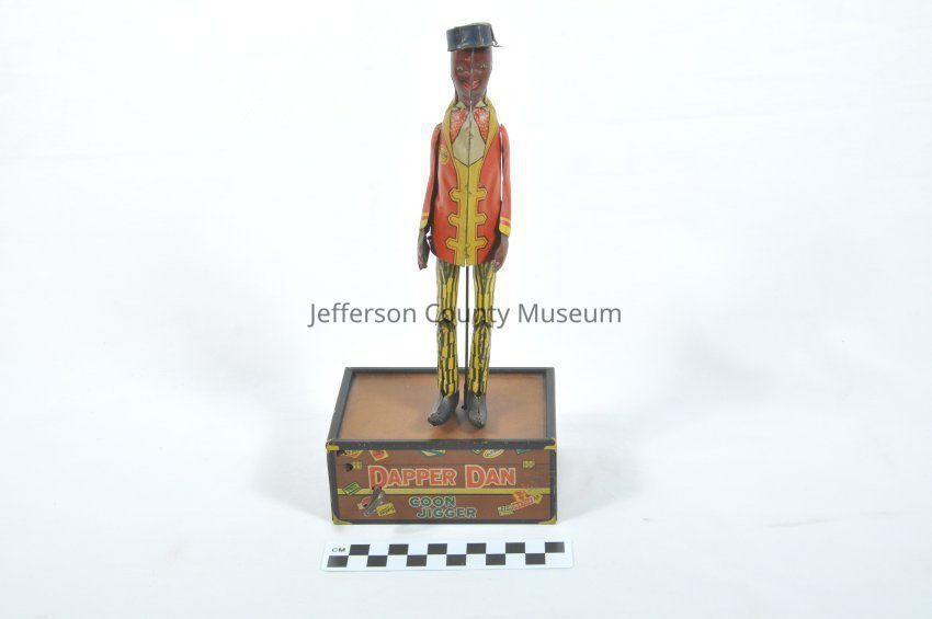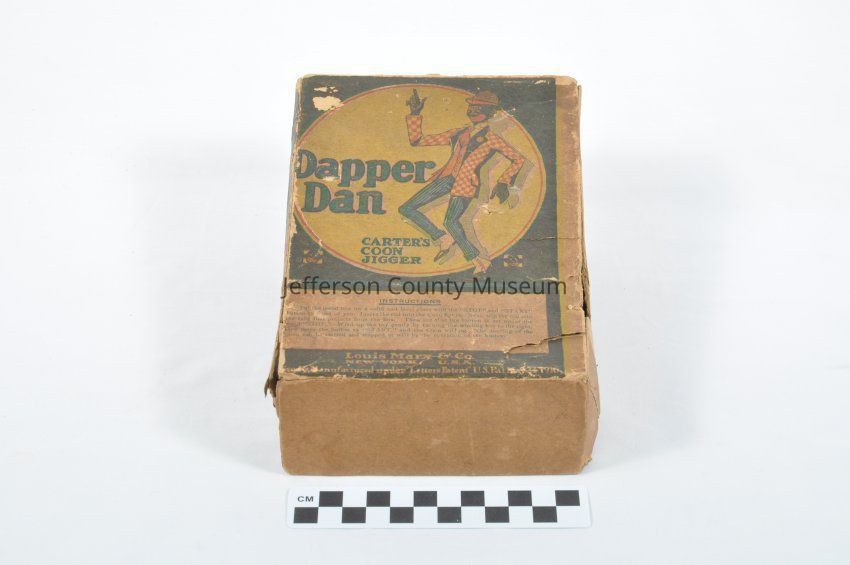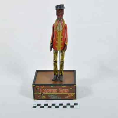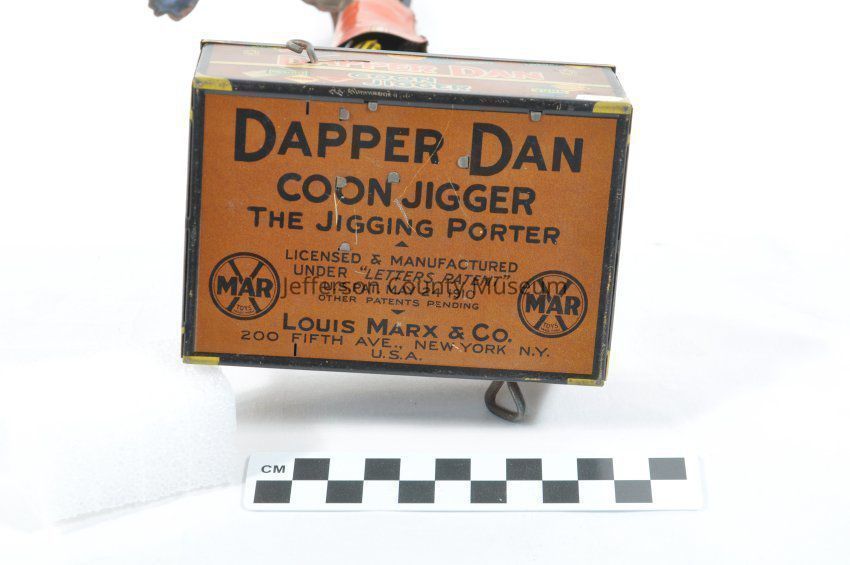 Tin toy (a) with depiction of an African American railroad porter standing on a box made to look like a traveling trunk. Porter has a red and yellow jacket and yellow and black trousers. When the toy was wound up the porter danced. On one side of box is a wind up key and on the other is a start/stop lever. On two sides of box "DAPPER DAN COON JIGGER". On bottom of box is "DAPPER DAN COON JIGGER THE JIGGING PORTER LICENSED & MANUFACTURED UNDER 'LETTERS PATENT' U.S. PAT. MAY 24, 1910 OTHER PATENTS PENDING LOUIS MARX & CO. 200 FIFTH AVE., NEW YORK N.Y. U.S.A.". Also has paperboard box (b) with it. The box has a picture of the dancing man and instructions. Reflects racist stereotypes of Jim Crow era.Acquisition