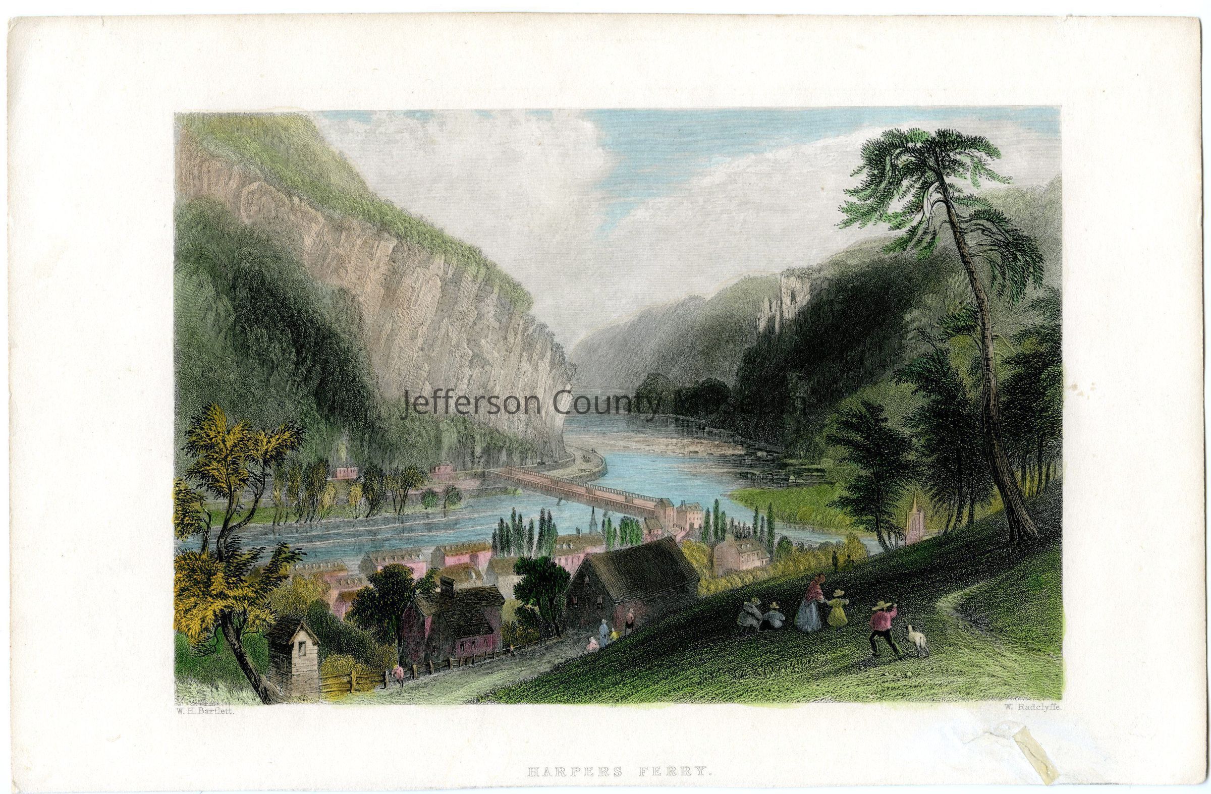 Steel plate engraving of Harper's Ferry. Hand coloring done later on.