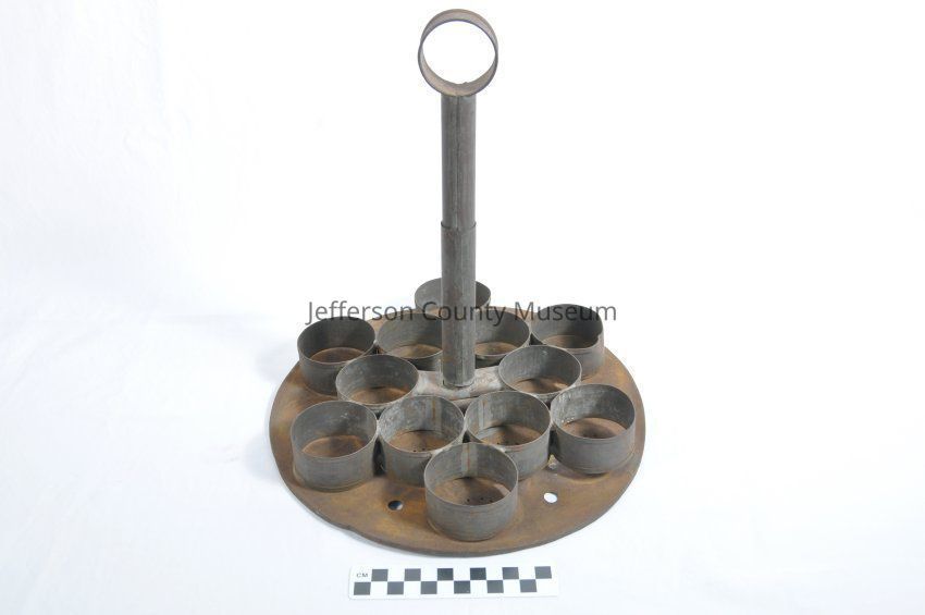 Round, tin implement, possibly a cookie or biscuit cutter. Bottom piece has many small holes. The piece on top of that has twelve connected circles of tin for cutting. Circular handle for carrying.Acquisition