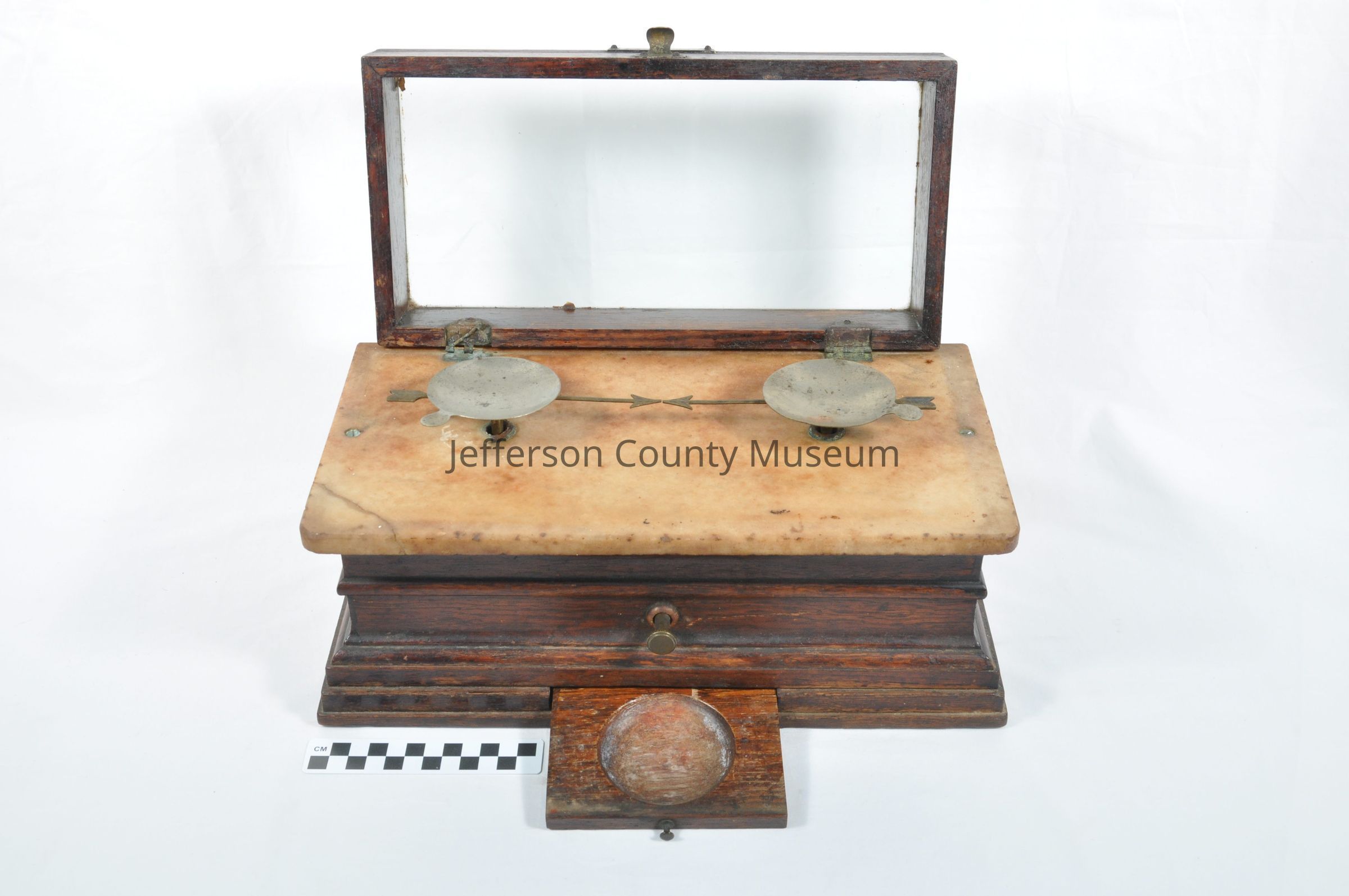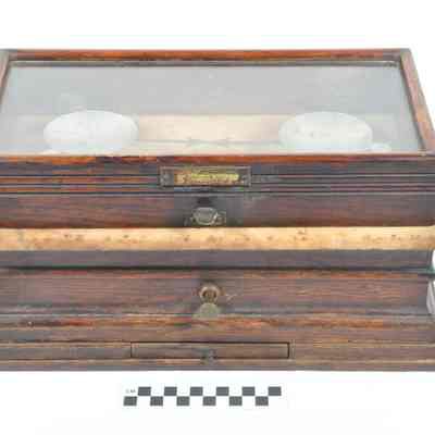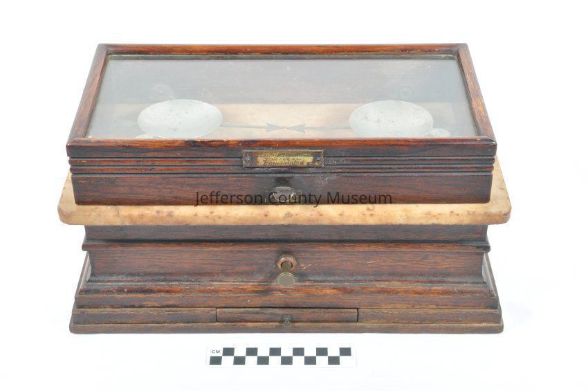 Oak, marble and brass scale with glass-top lid. Two removable tin pans for weighing drugs. Scale arms are arrows nearly touching one another. Label on lid says "Henry Troemner Maker, Philadelphia".Acquisition