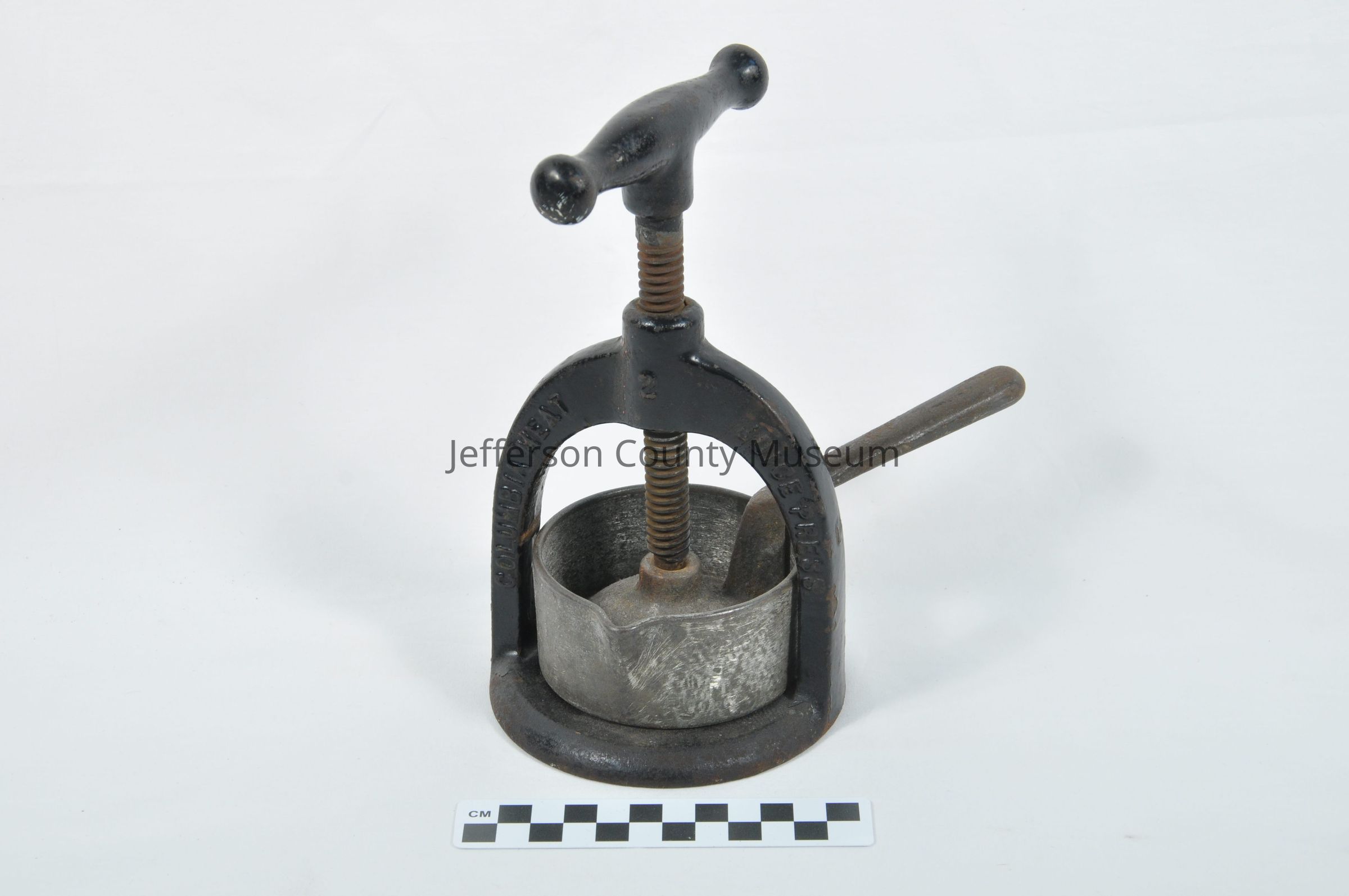 Screw-vise press with pan and press with handle. Pan sets on round metal bottom of vise and press is screwed down into pan. Marked "LANDERS, FRARY & CLARK NEW BRITAIN. CONN. U.S.A." on one side. Marked on the other side "COLUMBIA MEAT JUICE PRESS". Also marked with the number "2".Acquisition