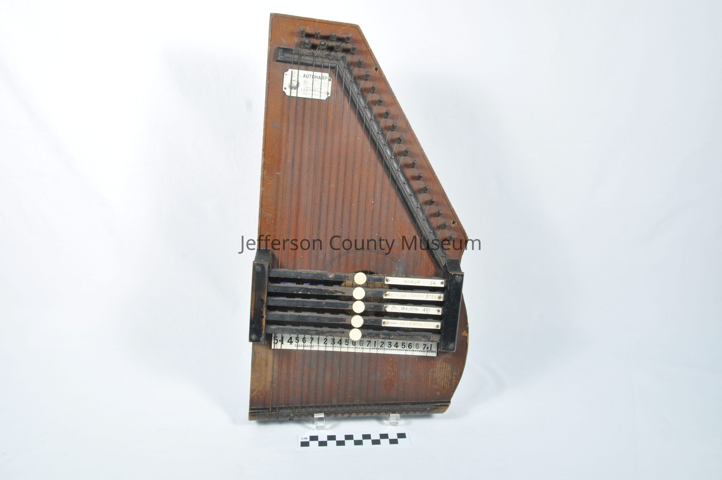 Wood and metal musical instrument once had 23 strings. Four are missing. There is a wooden block over the keys with five wood bars for changing pitch or key. There is a white number and letter chart under the keys near one end. Near the other end is a white label with a man's image, the word "AUTOHARP", several patent dates in 1894 and "MANUFACTURED BY C.F. ZIMMERMAN CO. DOLGEVILLE, N.Y. U.S.A.". A label on back in shape of a shield says "WASHINGTON, D.C. FROM E.F. DROOP SONS STEINWAY PIANO WAREROOMS 925 PENN. AV. N.W.".Acquisition