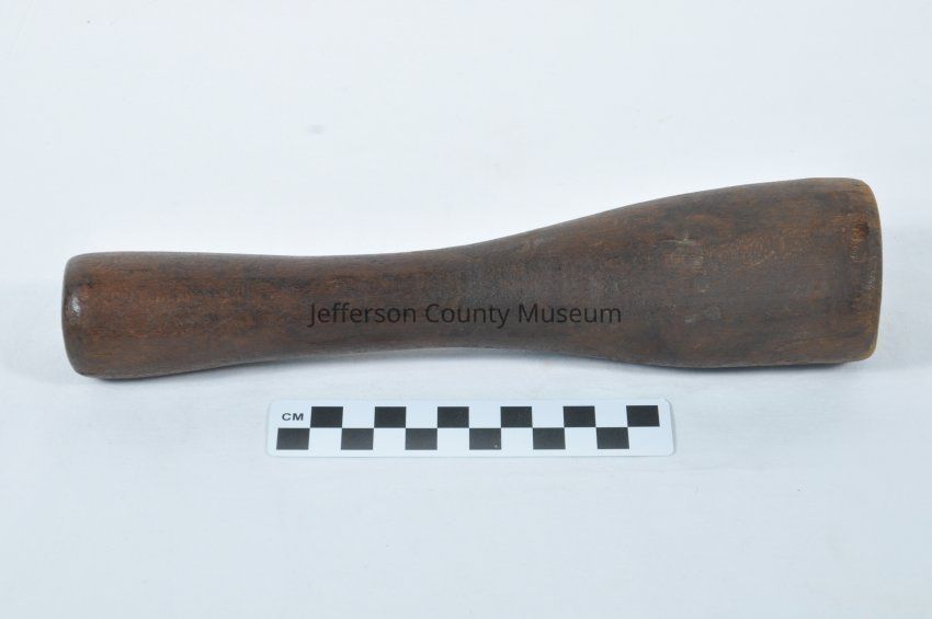 One piece wooden dough beater with appearance of a mallet. Thicker on one end than the other.Acquisition