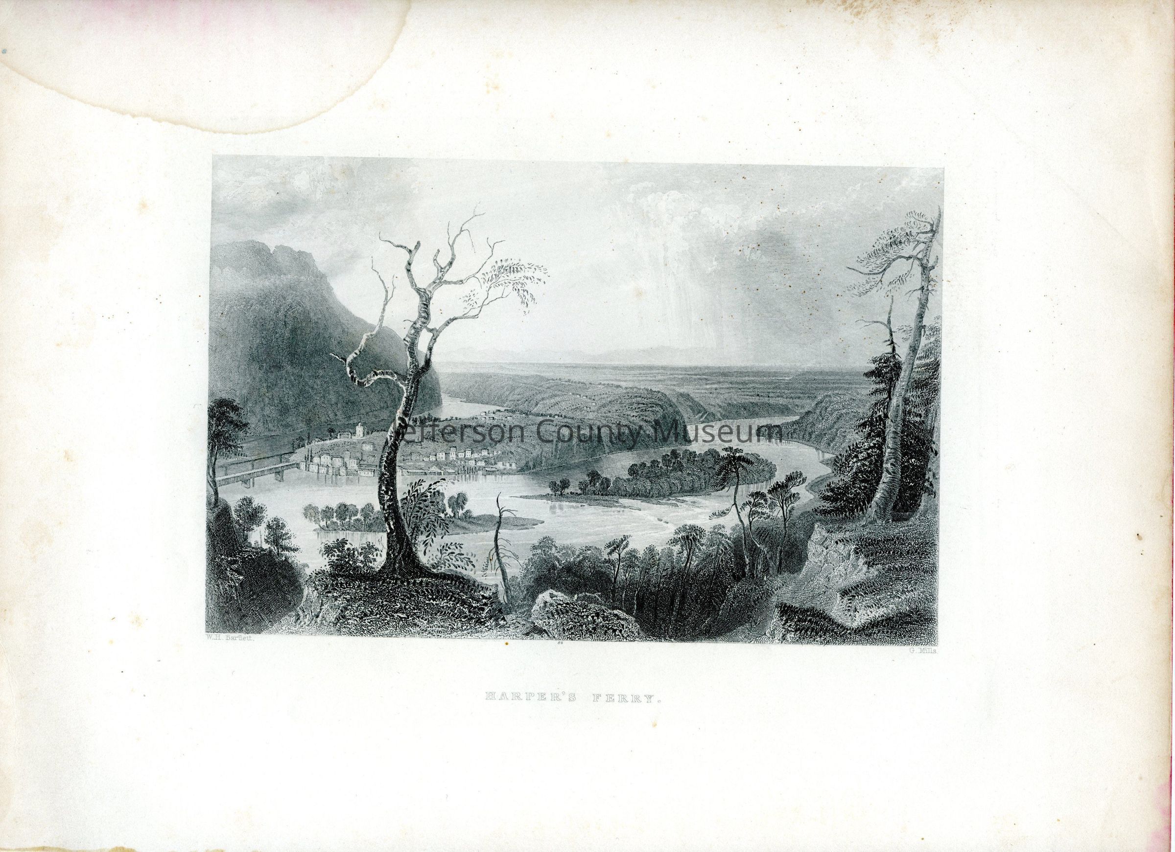 Steel plate engraving of a scenic view of Harper's Ferry and the Potomac and Shenandoah Rivers. Remnants of binding indicate that the engraving was possibly from a book of some sort. Source unknown.