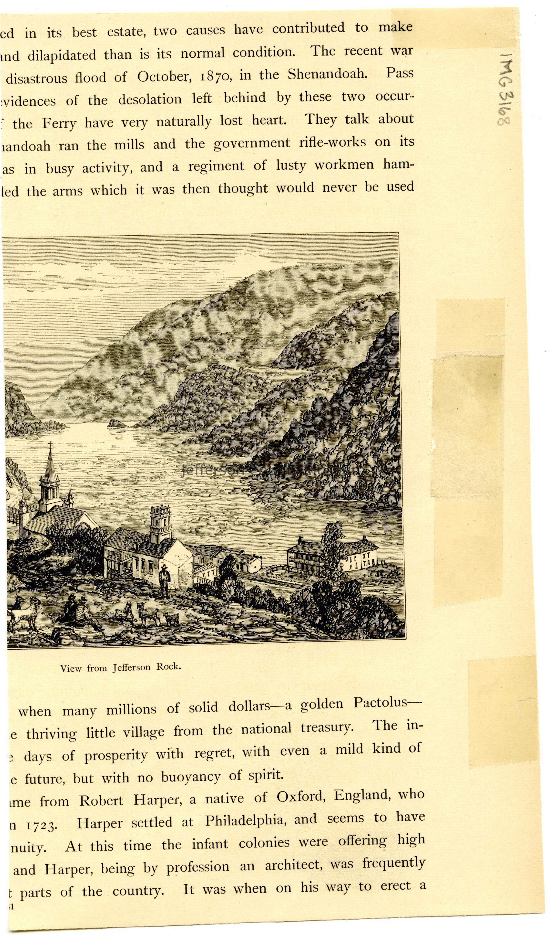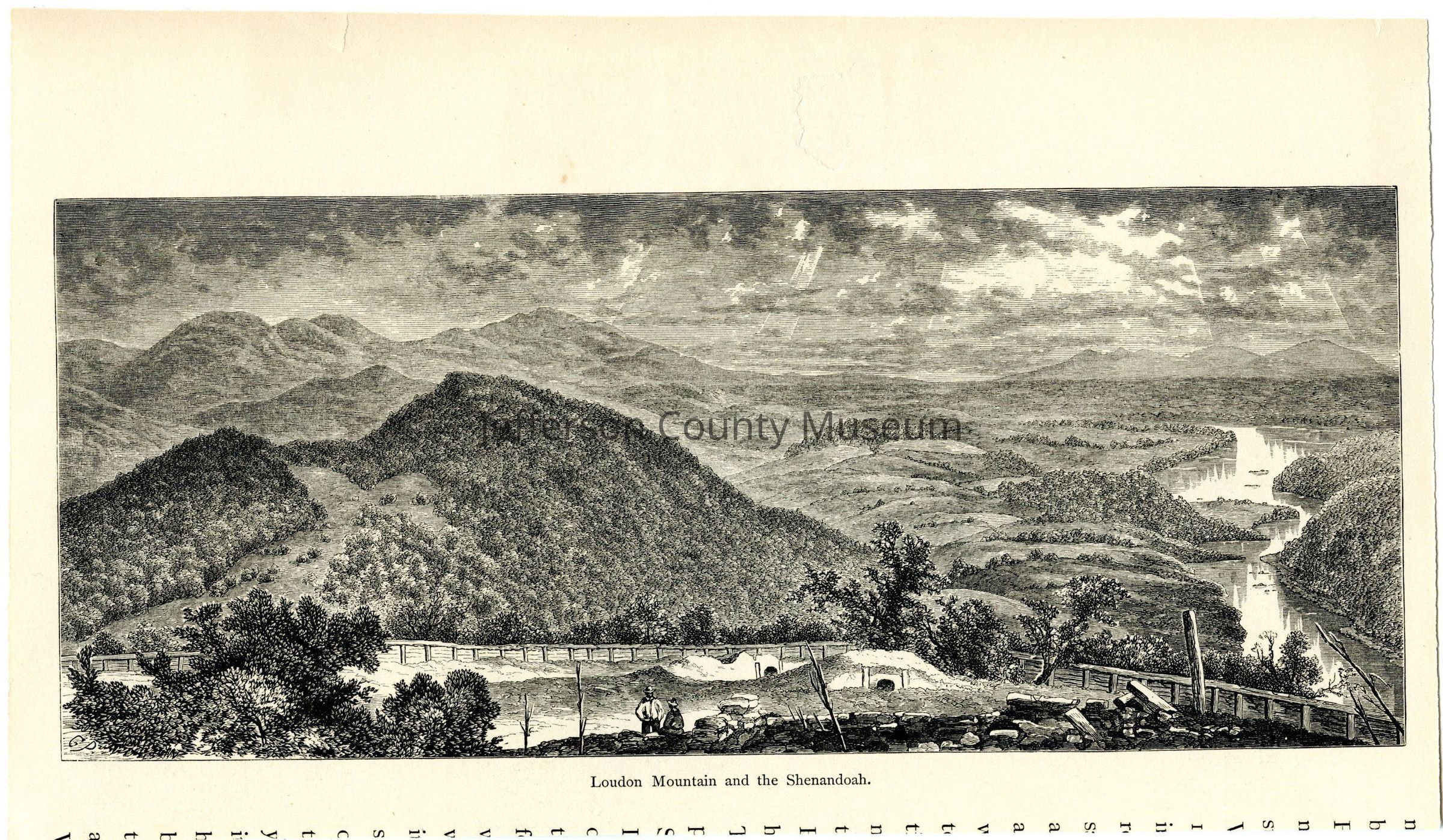 Backside contains printed text from the source (above), as well as another engraving of Harper's Ferry, titled "View from Jefferson Rock", pg. 321. Entire piece is cut short so text is not fully legible, only to fit the size of the engraving "Loudon Mountain", pg. 322.Acquisition