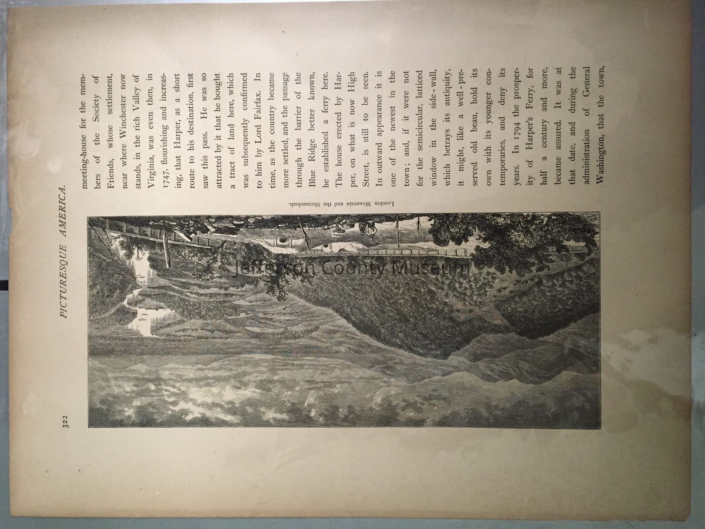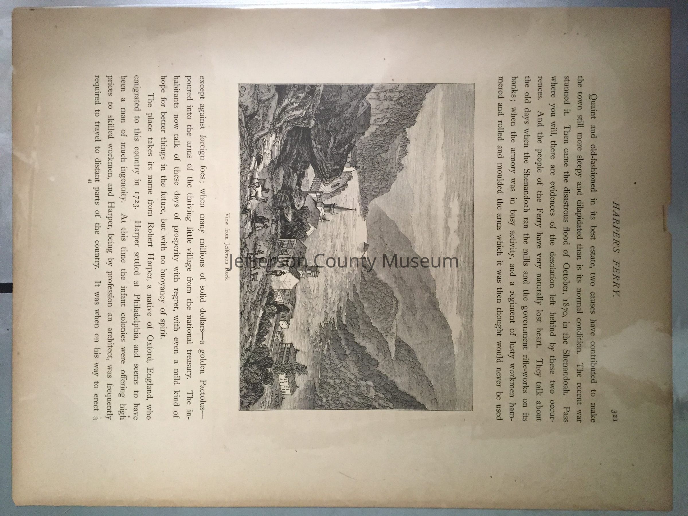 Both sides of the page contain printed text from the source (above). A second engraving, possible wood engraving, of Harper's Ferry, titled "View from Jefferson Rock", can be found on pg. 321.Acquisition