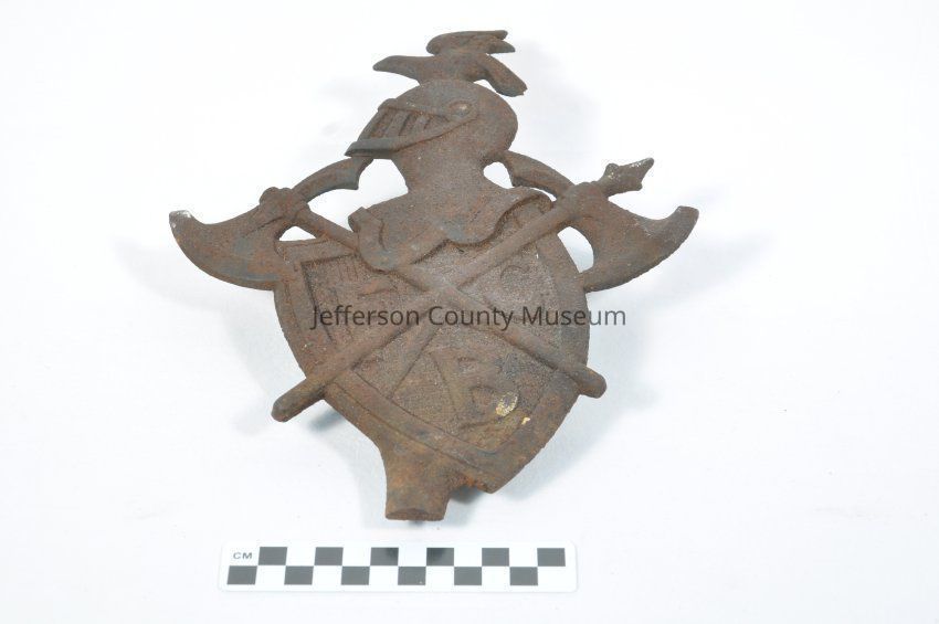 Iron plate with two halberds crossed over a shield. An armor helmet is above the shield with a bird sitting on the helmet. "F C B" is on the shield. Embossed on the back is "ANDERSON, IND."Acquisition