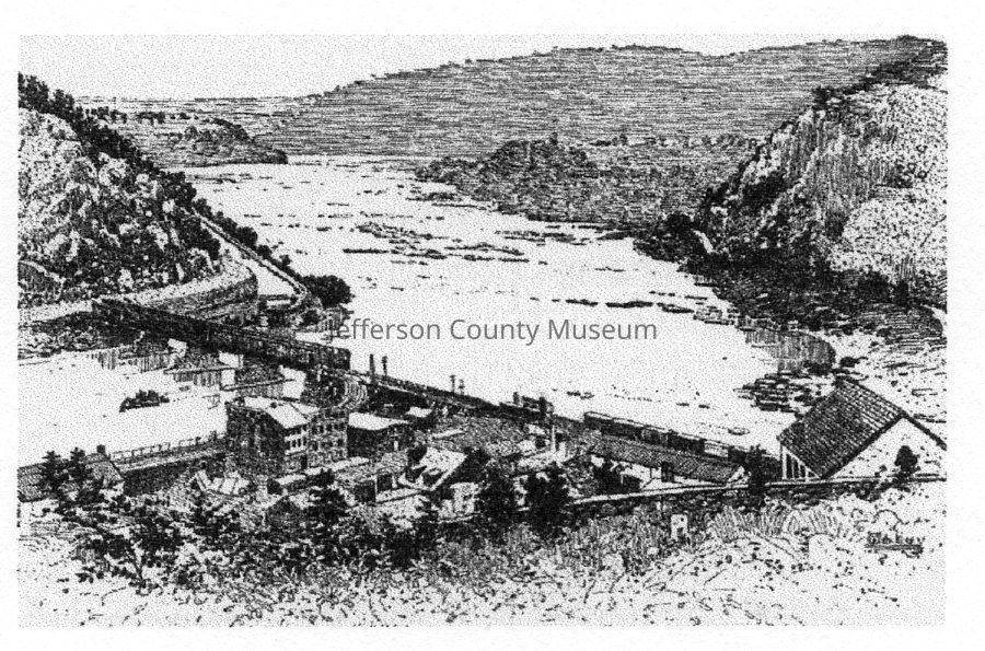 Harpers Ferry, looking down the Potomac, placed between the years 1885-1886, modeled from an engraving from the year 1861. This particular cataloged document is a digital file, retrieved from an online book.