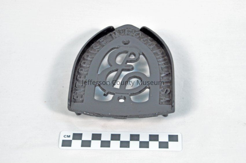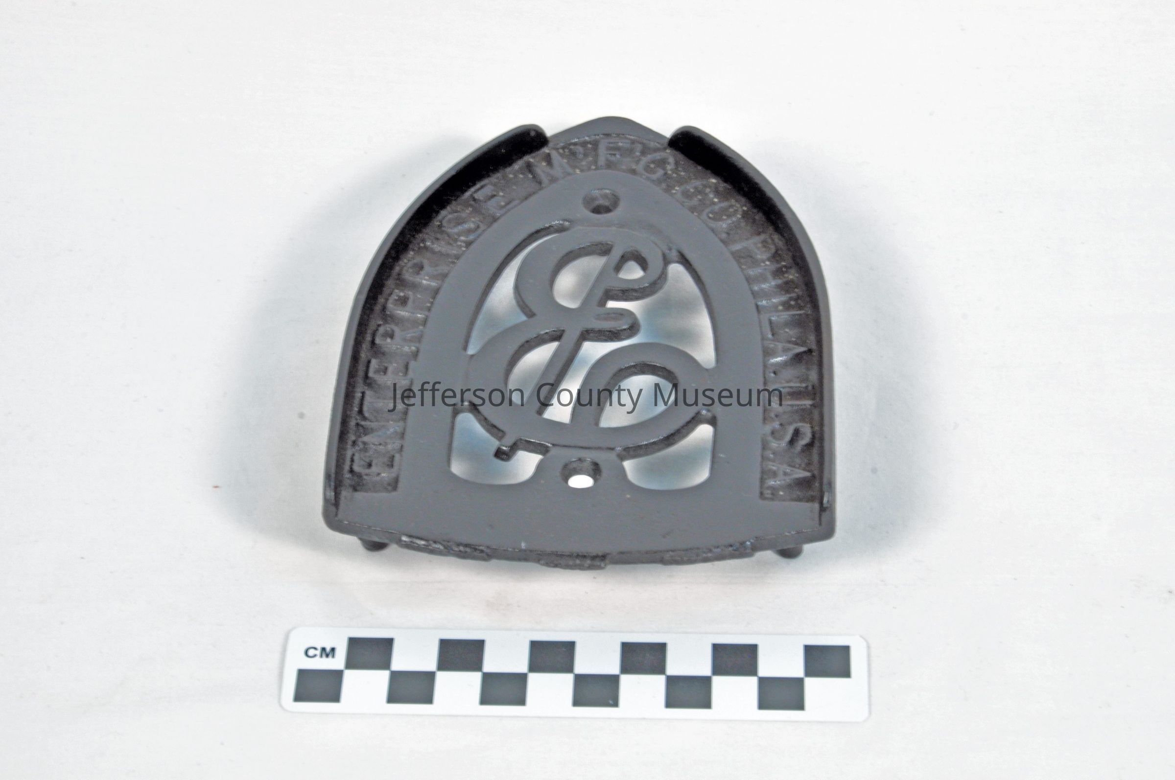 Iron trivet for holding a hot flat iron painted black. The center part of the trivet is a large "&". Embossed around the edge is "ENTERPRISE M'FG. CO. PHILA. U.S.A.".Acquisition