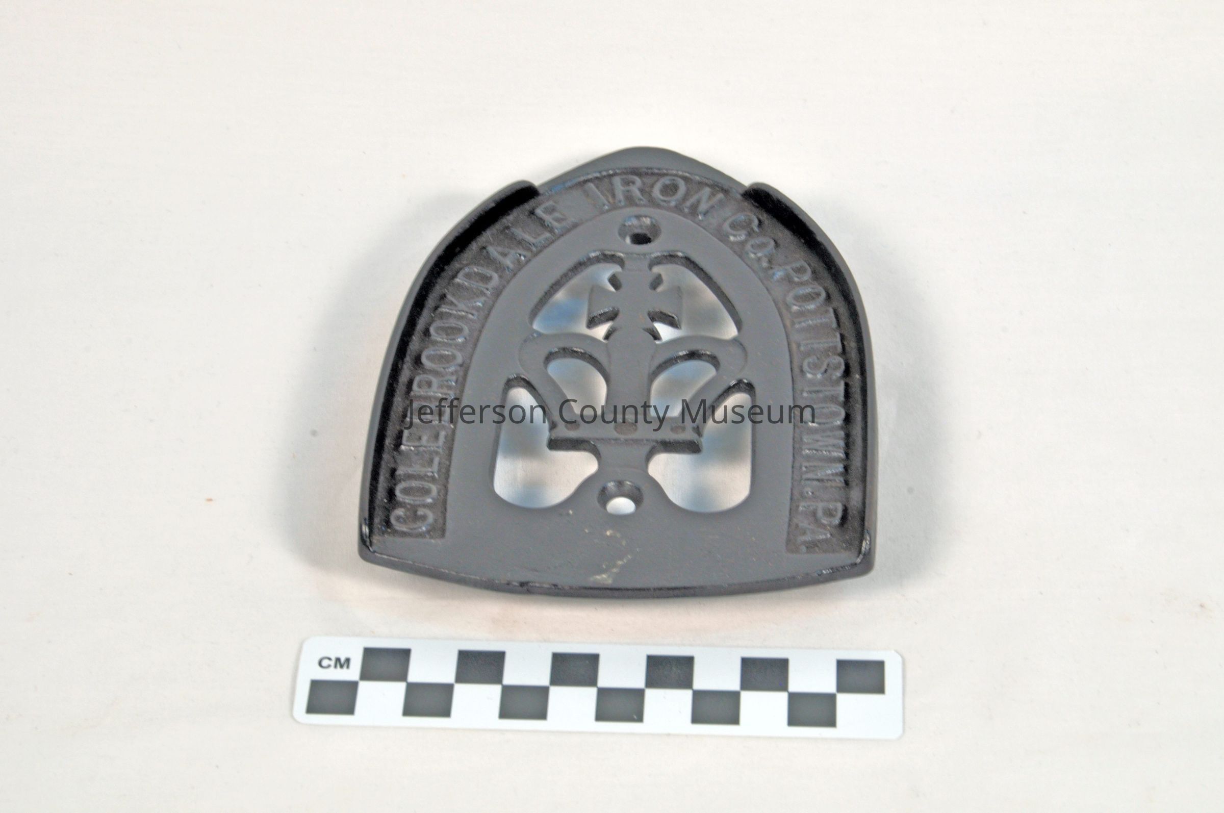 Iron trivet for holding hot flat iron painted black. Center if trivet is a crown with an iron cross on top. Embossed on edge is "COLEBROOKDALE IRON CO. POTTSTOWN. PA.".Acquisition