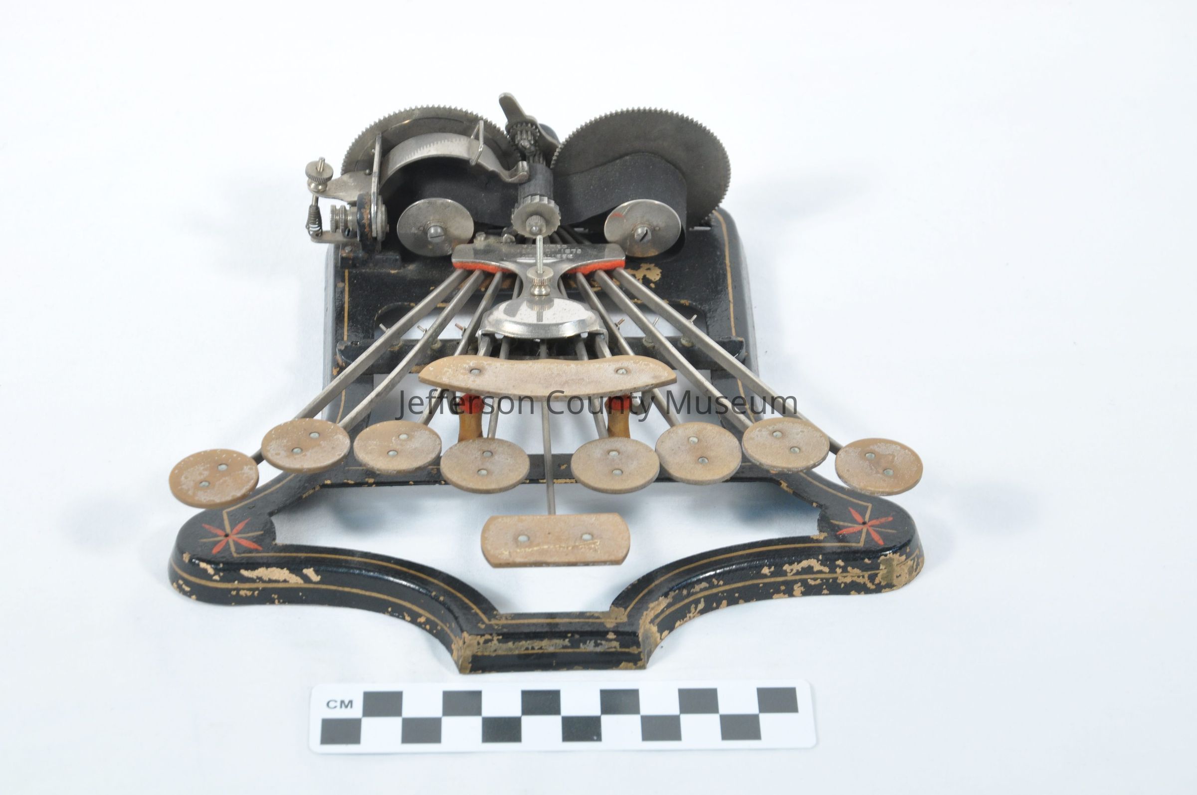 This machine was probably made for typing coded messages. There are ten composite fiber keys, an inked ribbon and several gears and wheels at the heart of the mechanism. Painted black with gold and red trim. Stamped on a plate near the gears "PATENTED MAY 20, 1879 APR 4, 1882".Acquisition