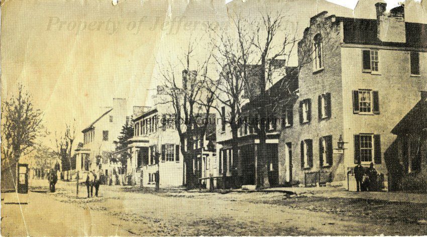Looking east on Washington Street, Charles Town, showing Carter House. First building is the Carter House which was torn down in 1904. Believed to be the only copy.Acquisition