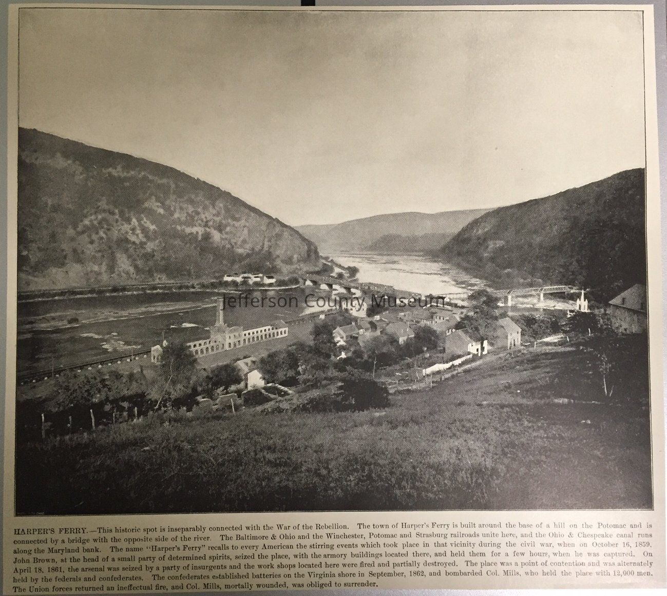 Panoramic view of Harper's Ferry. The title and description below the photograph provide a brief history of the town and its involvement in the Civil War. From a newspaper article.