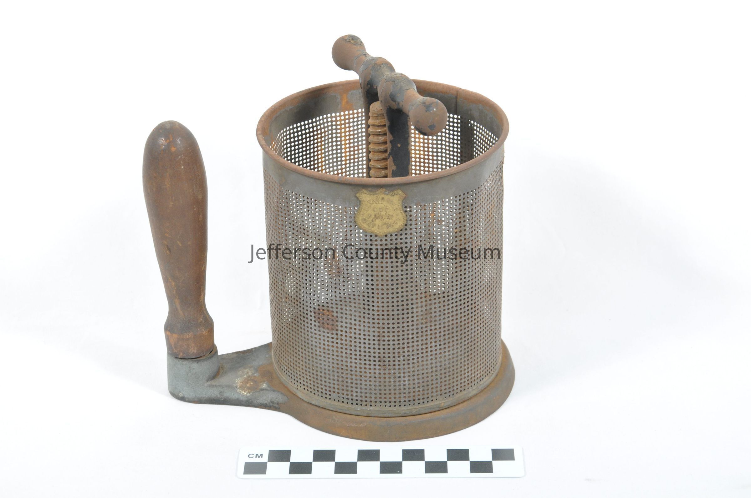 Food press with removable tin can with many small holes. Press is on a large screw. Wooden handle attached to one side. Embossed on bottom of disk shaped press "PAT'D AUG 12, 1873". Small brass shield shaped label on can "DETACHABLE CUP PAT'D MAY 11, 1875"Acquisition