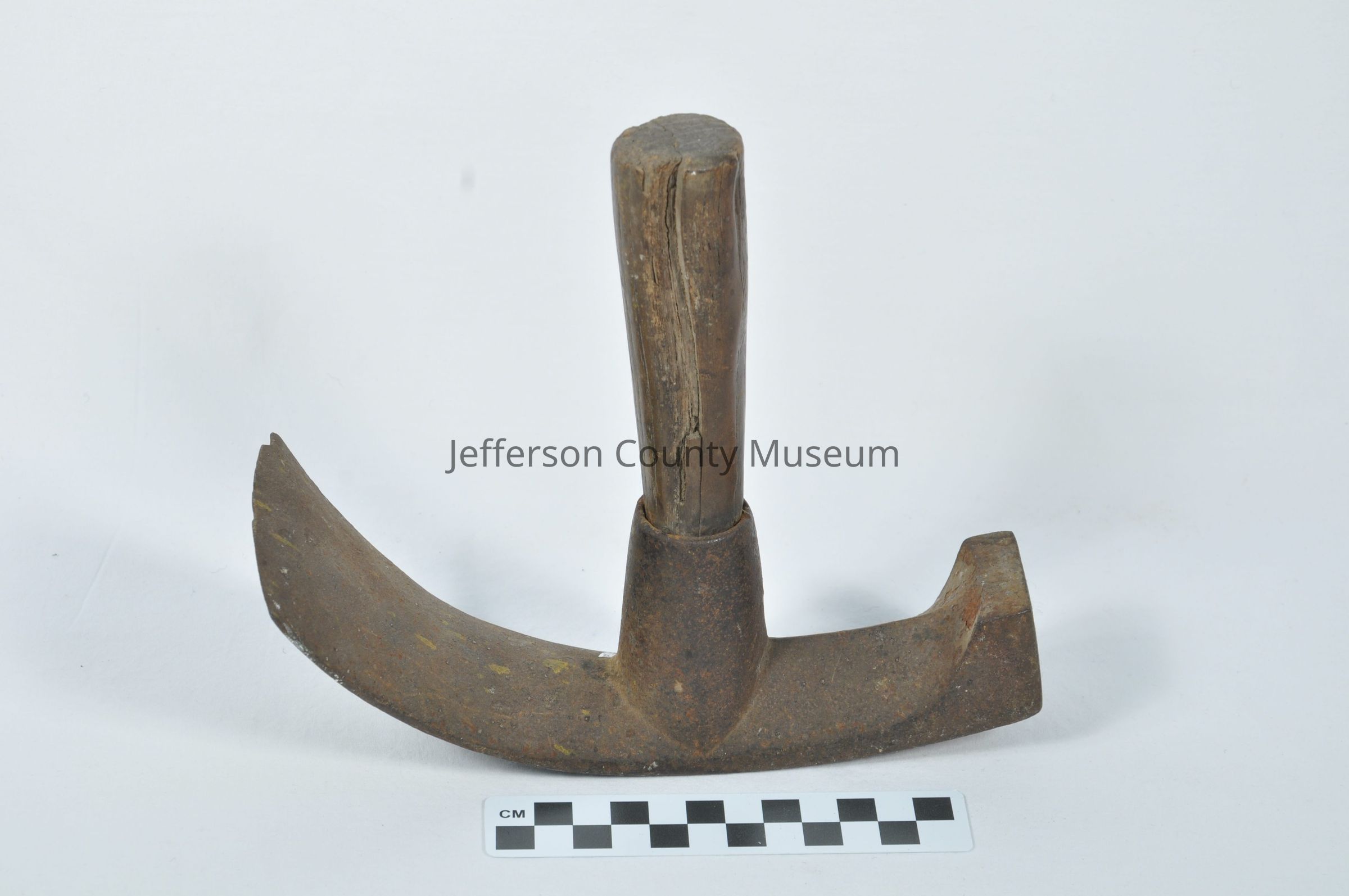 Adze/hammer with short wooden hand and heavy hammer head. The adze part of the head has a severe curve to it.Acquisition