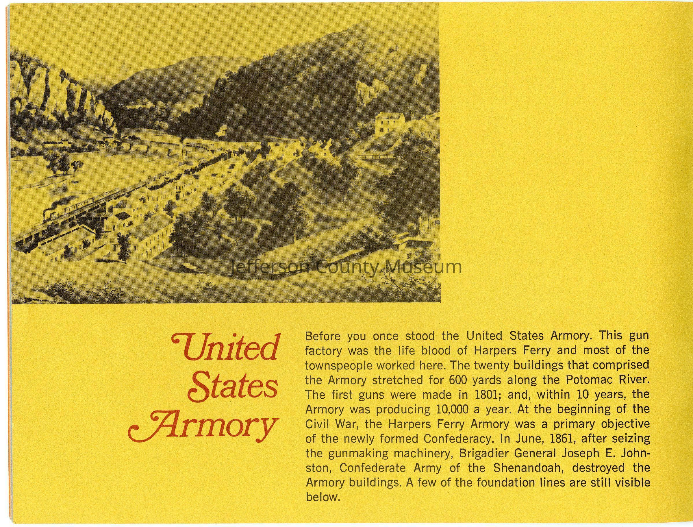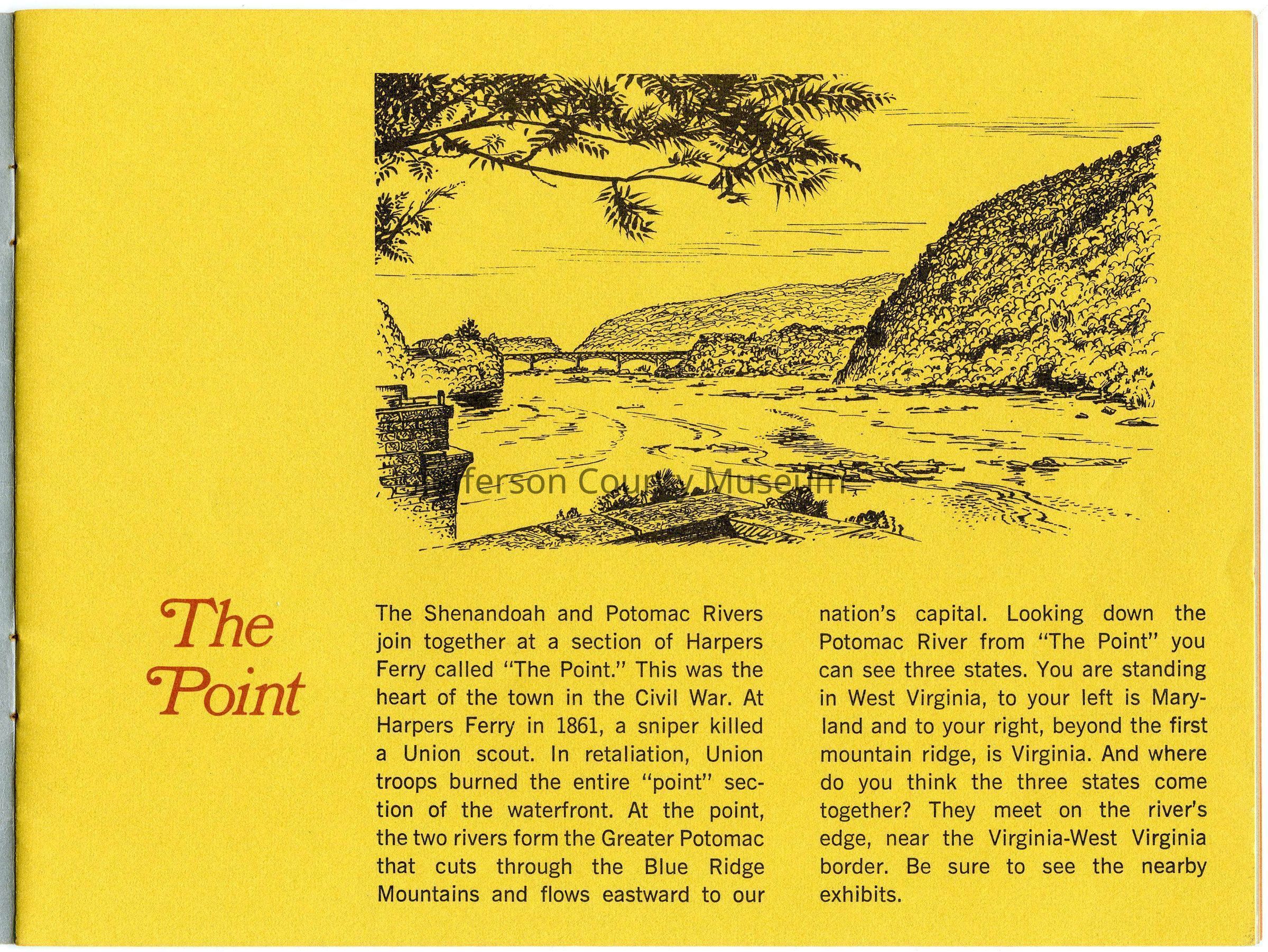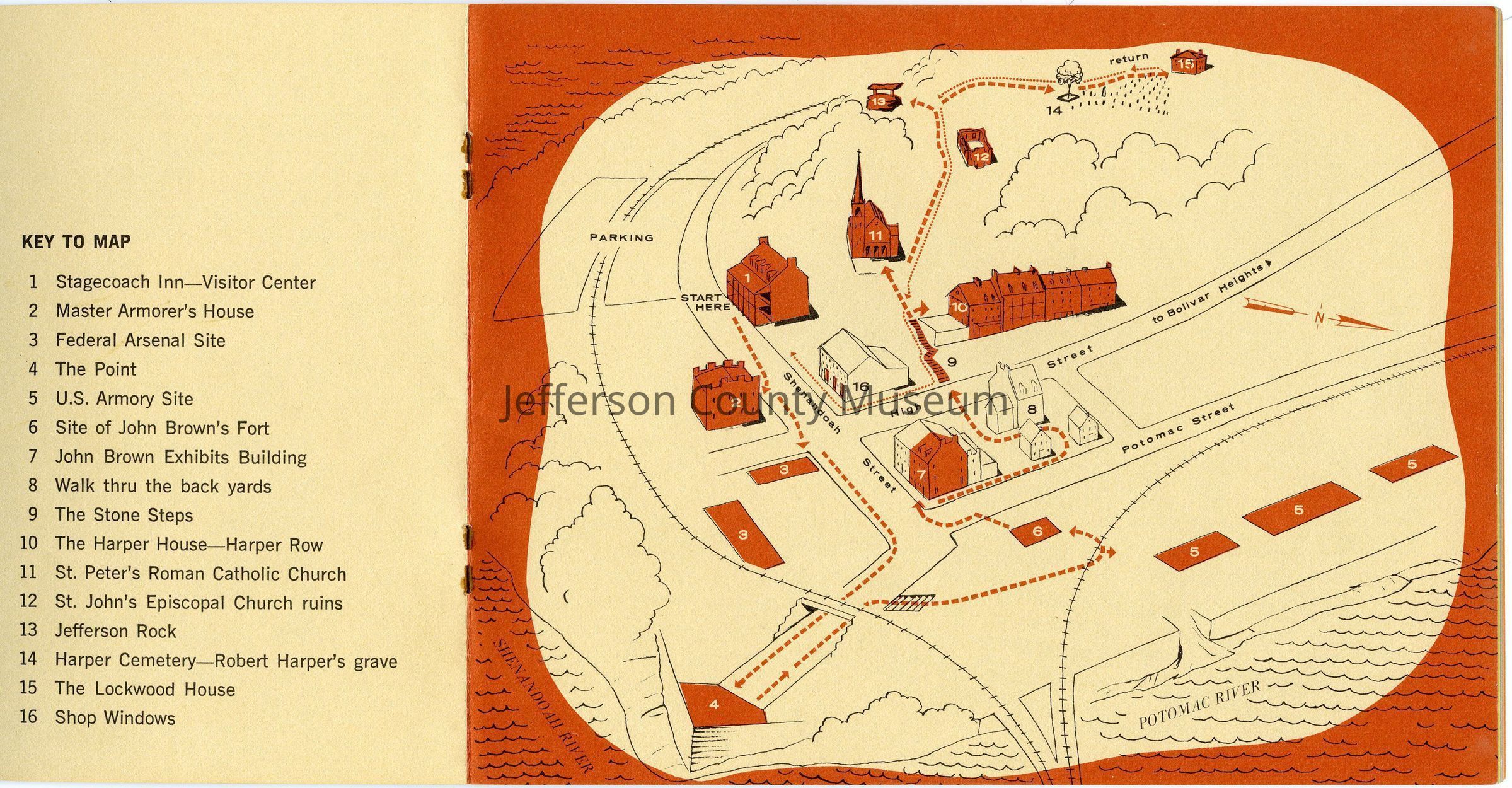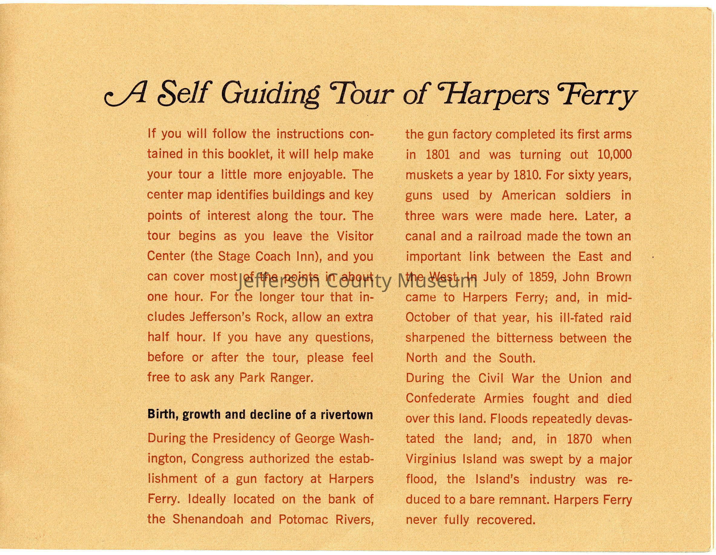 This colorized booklet contains images and brief written histories to supplement a visitor's walking tour throughout Harper's Ferry. The booklet contains items such as maps, hand drawn images, photographs, and text pertaining to a number of places in the area. The booklet was published and distributed by the Harper's Ferry National Park and the National Park Service.