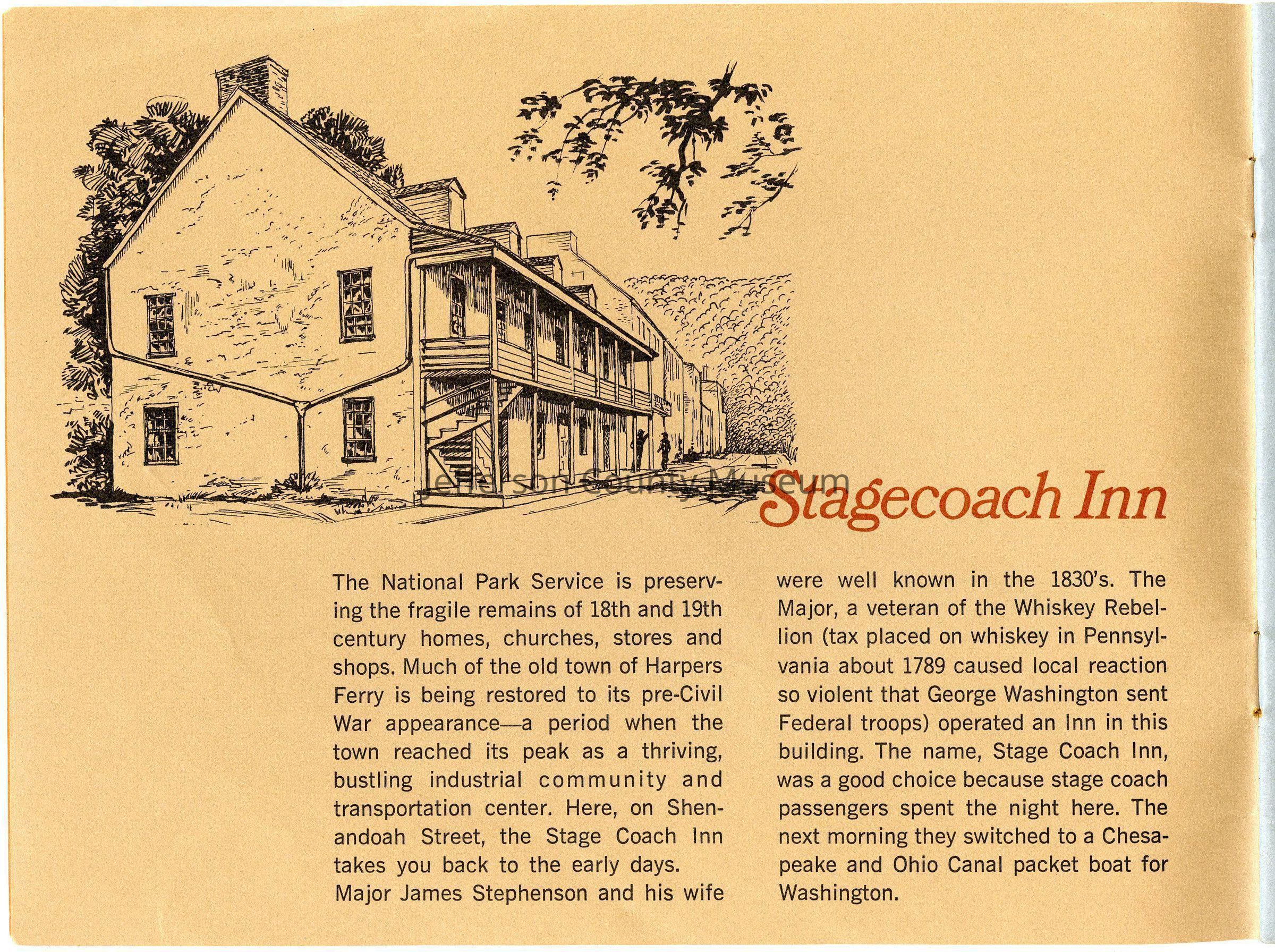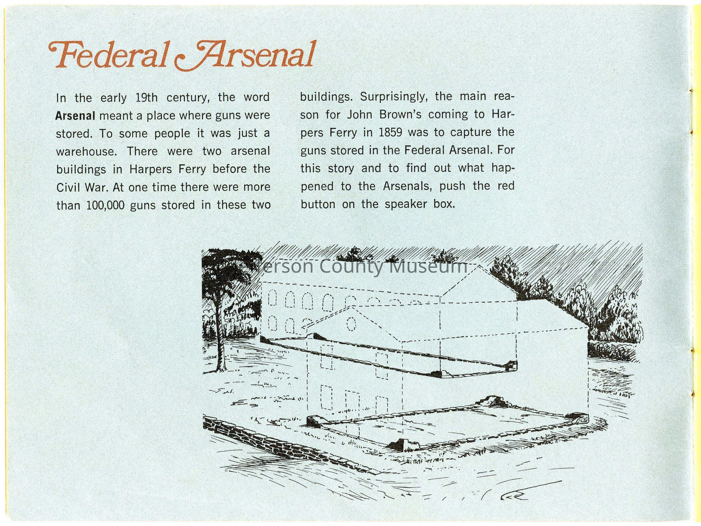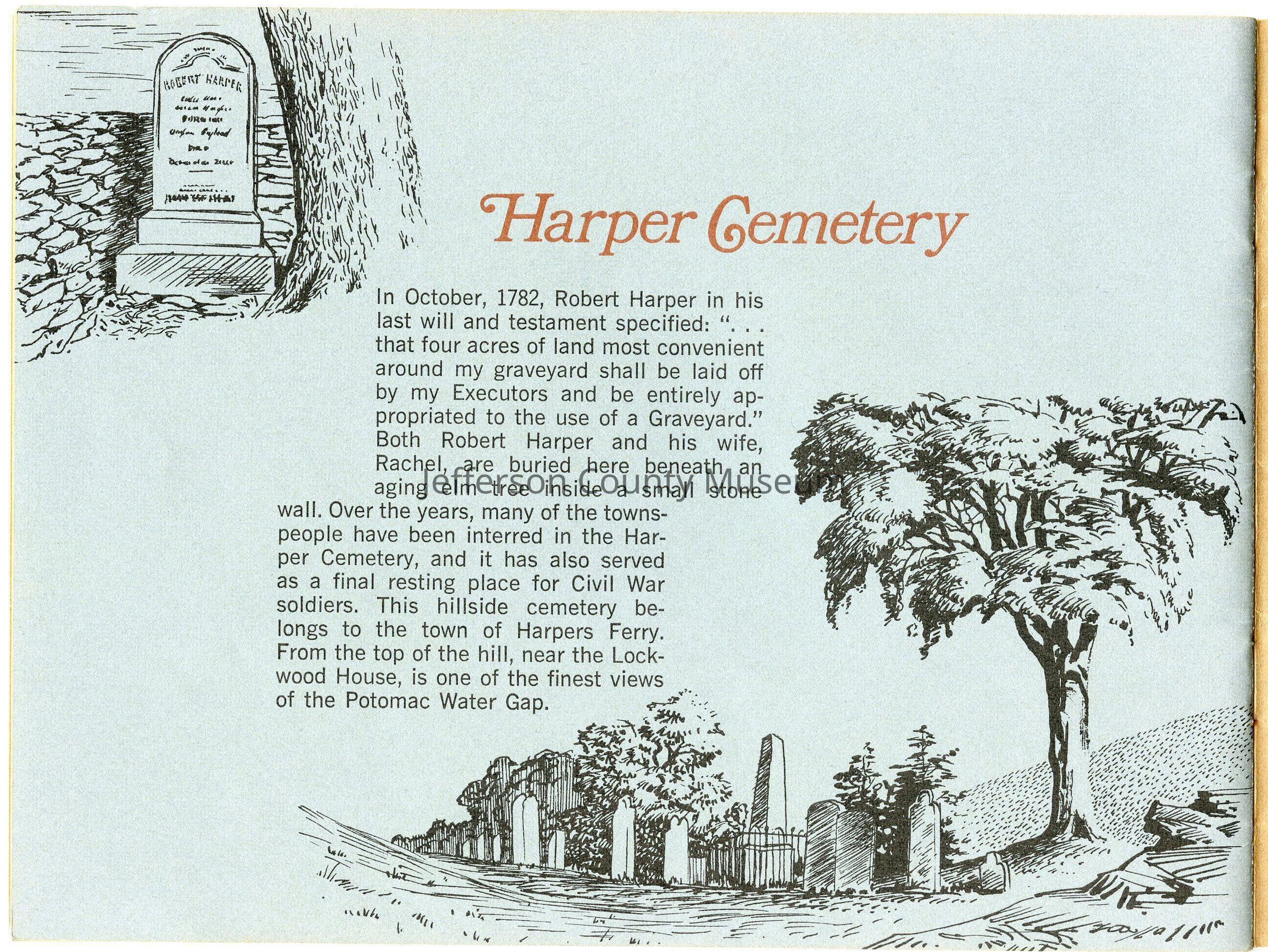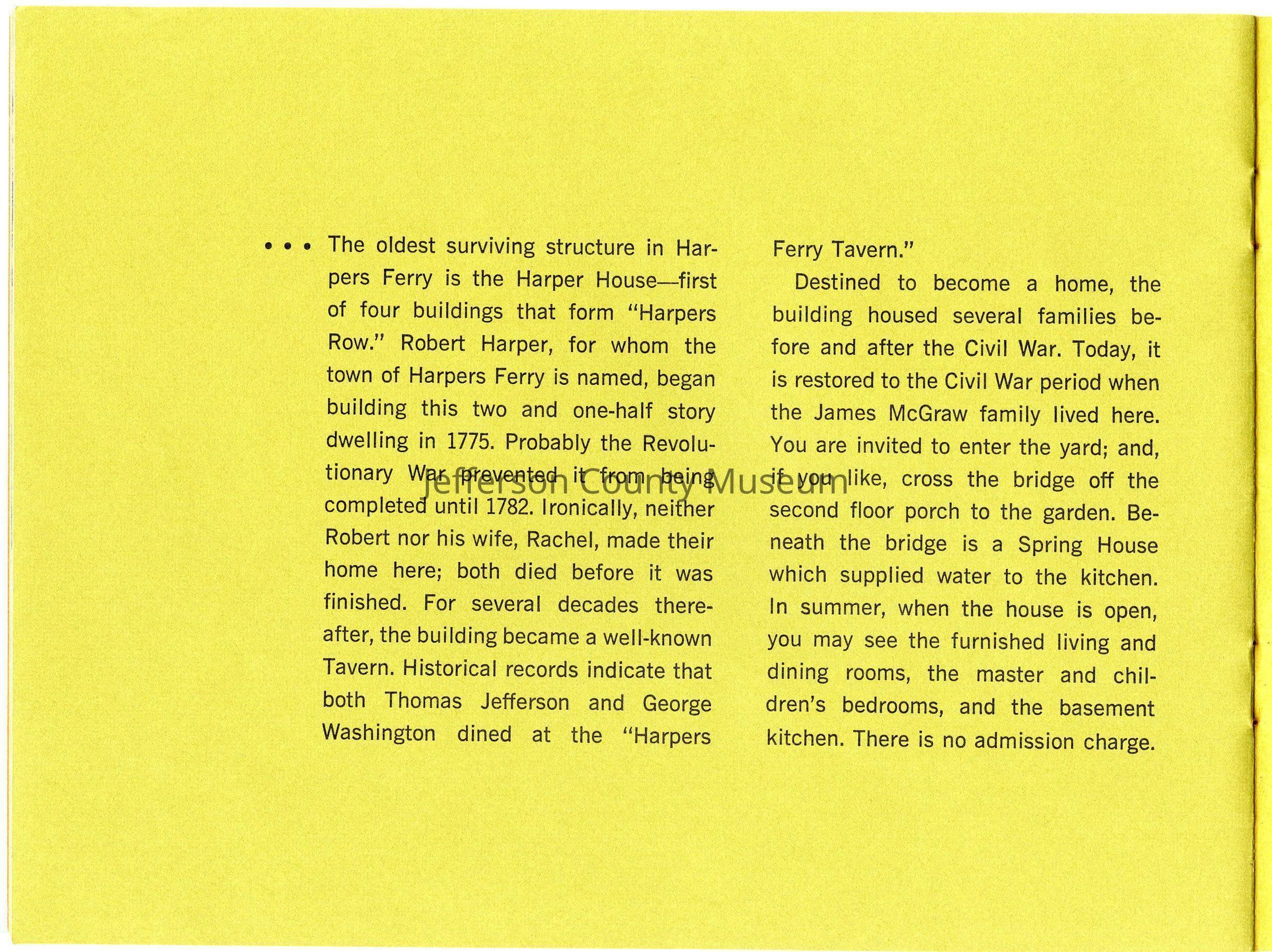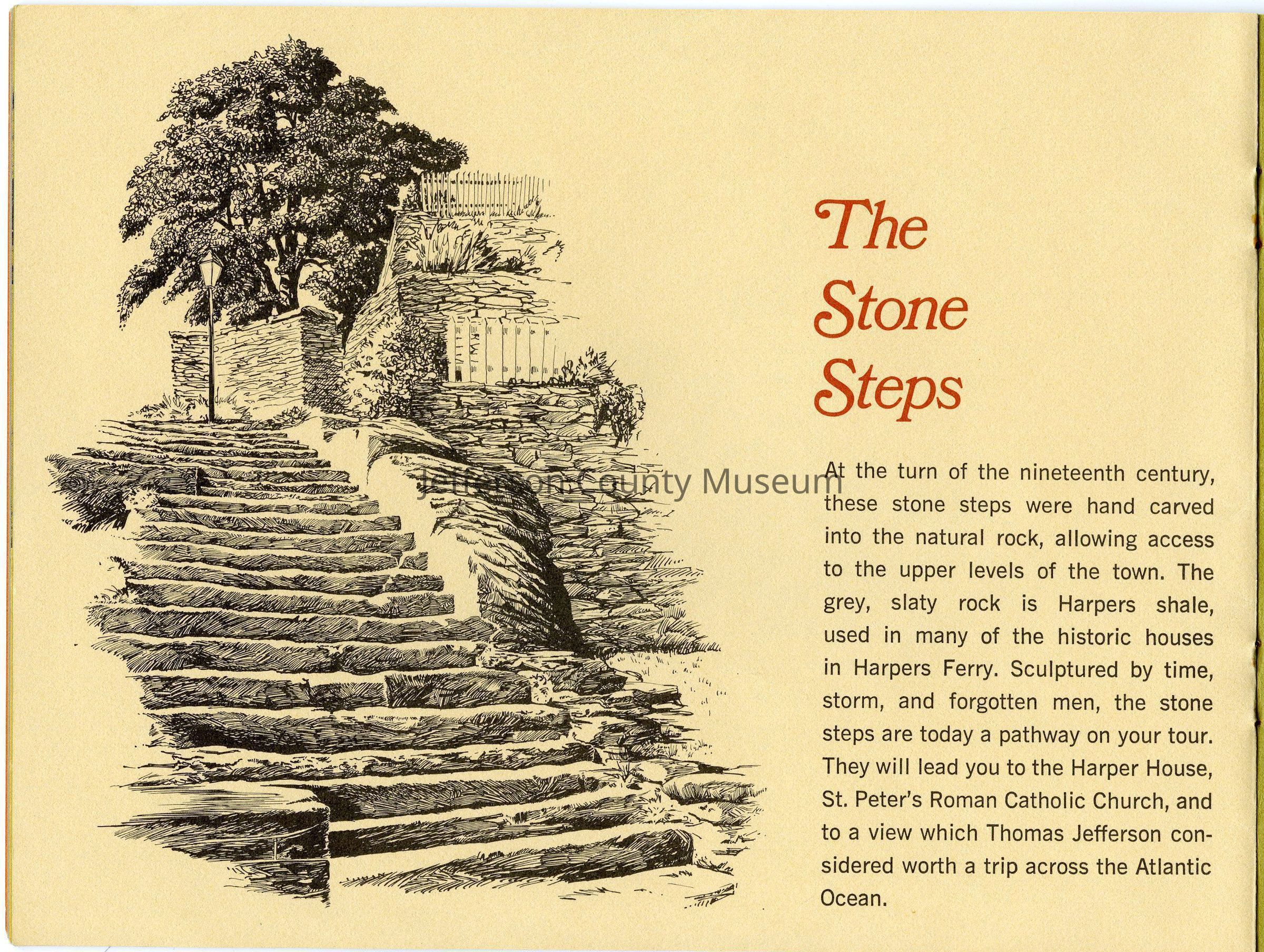 This colorized booklet contains images and brief written histories to supplement a visitor's walking tour throughout Harper's Ferry. The booklet contains items such as maps, hand drawn images, photographs, and text pertaining to a number of places in the area. The booklet was published and distributed by the Harper's Ferry National Park and the National Park Service.