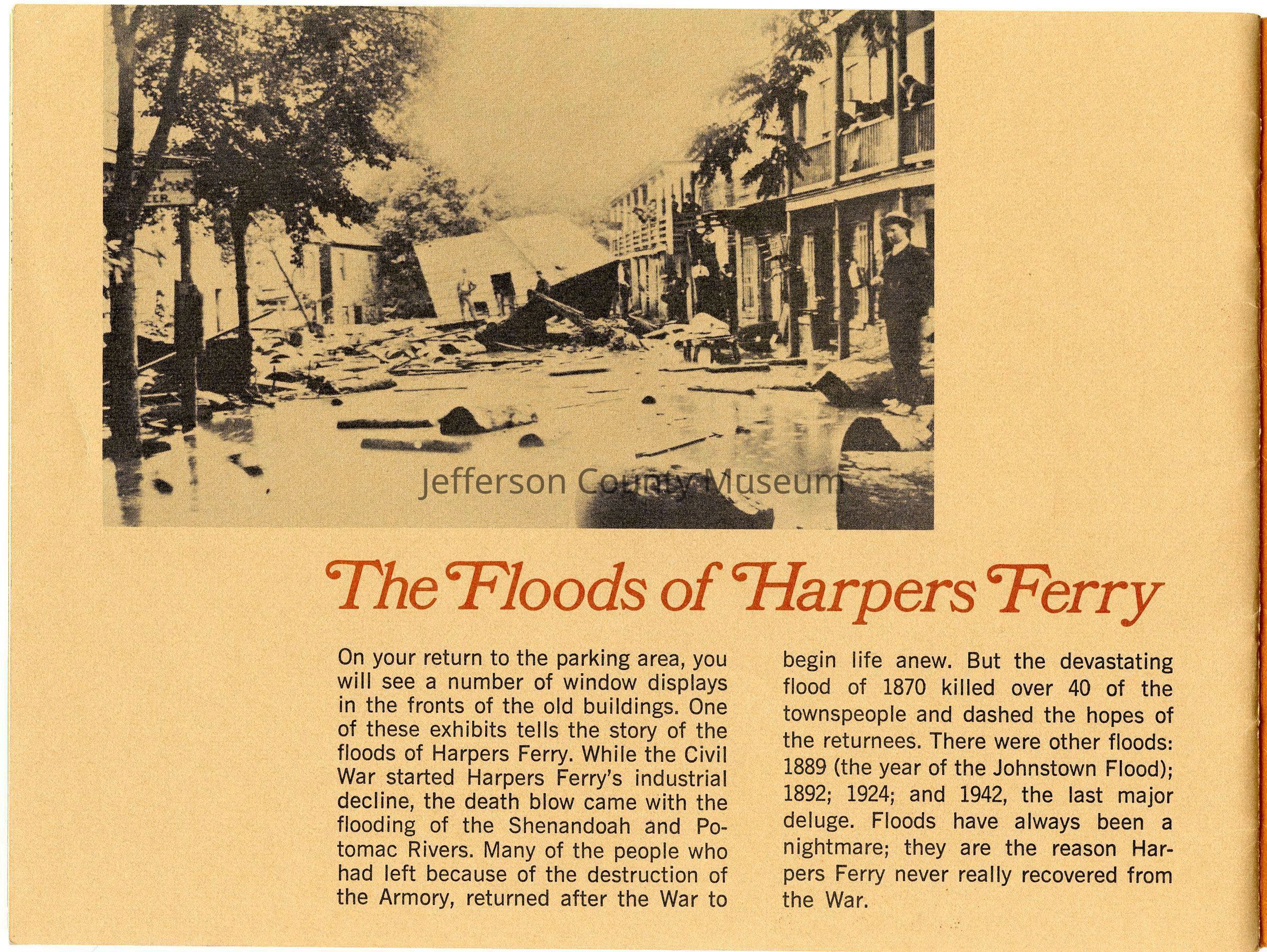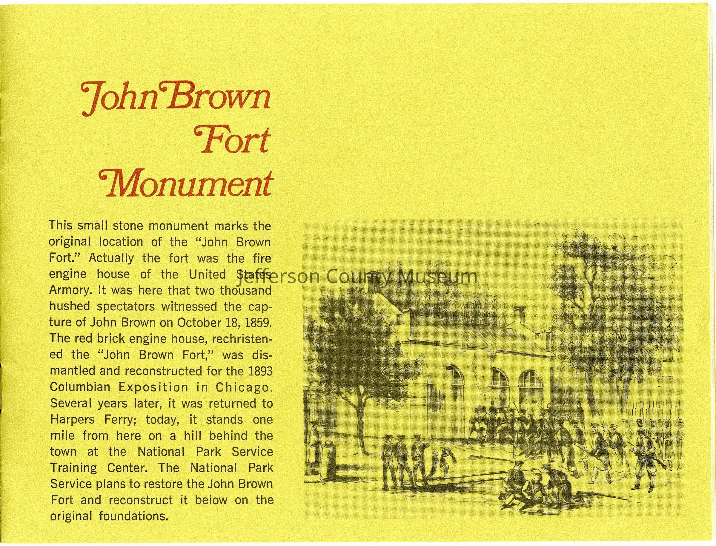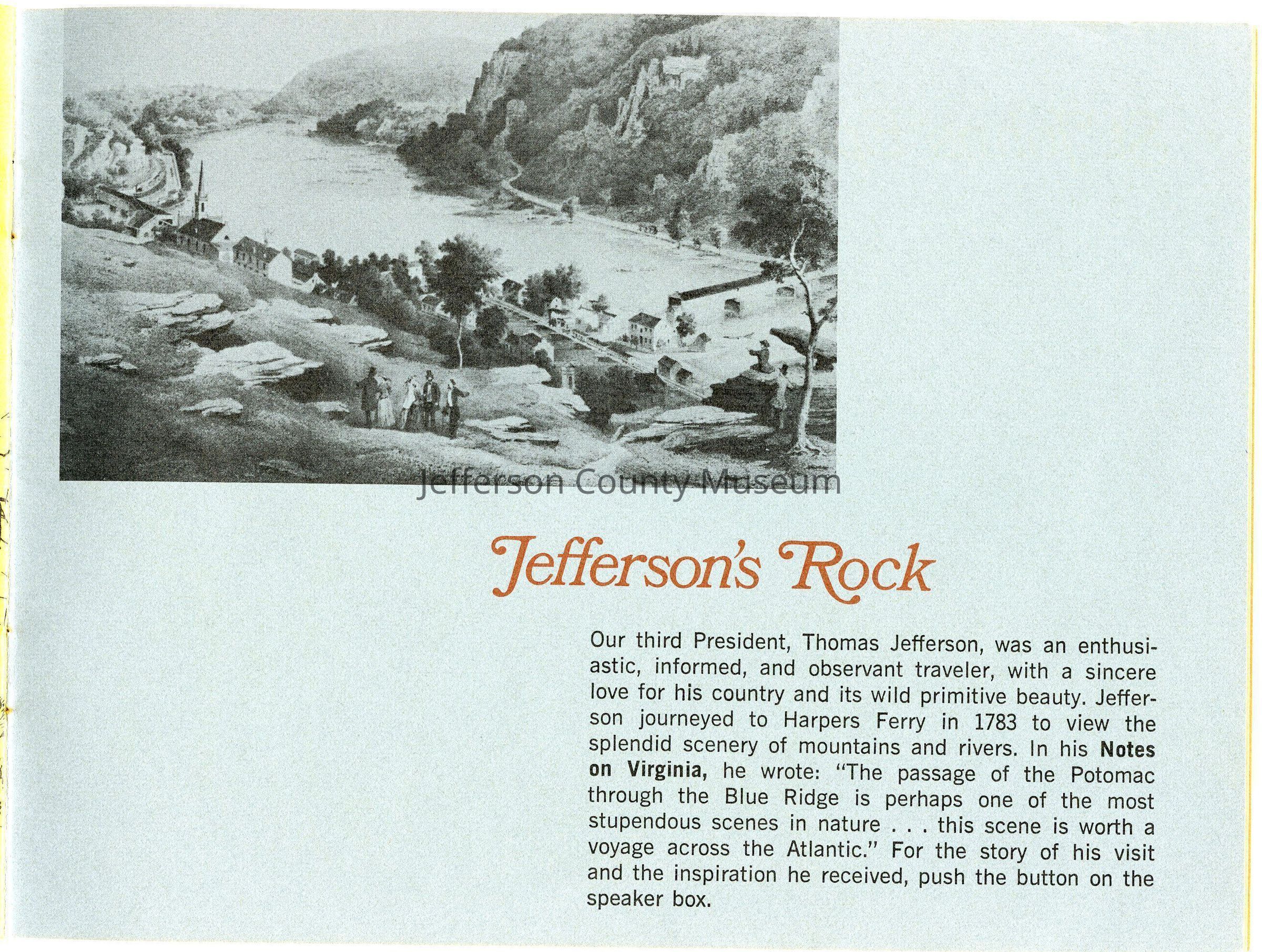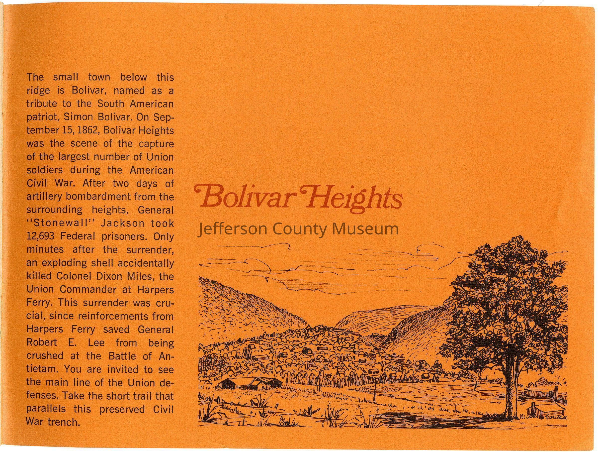 This colorized booklet contains images and brief written histories to supplement a visitor's walking tour throughout Harper's Ferry. The booklet contains items such as maps, hand drawn images, photographs, and text pertaining to a number of places in the area. The booklet was published and distributed by the Harper's Ferry National Park and the National Park Service.