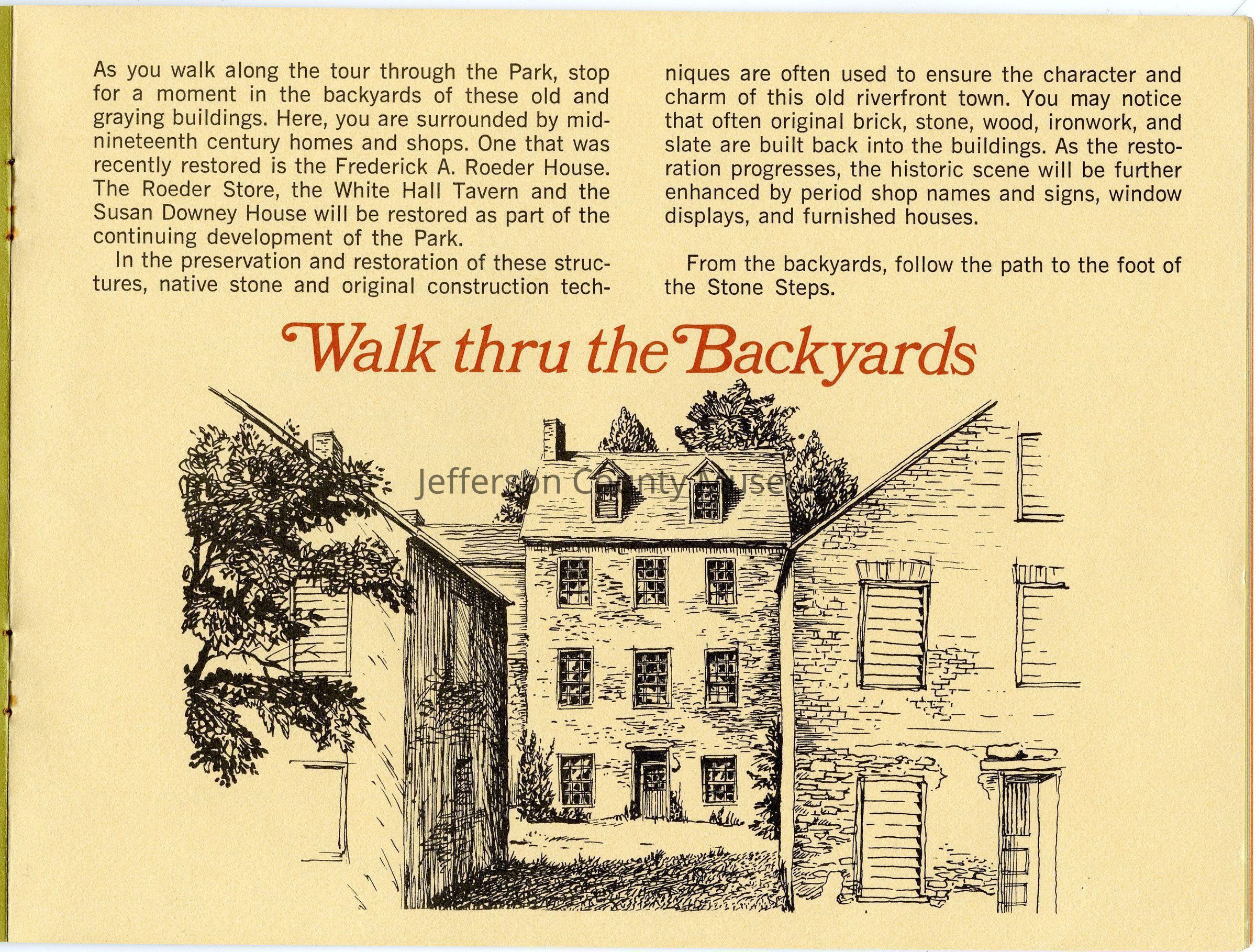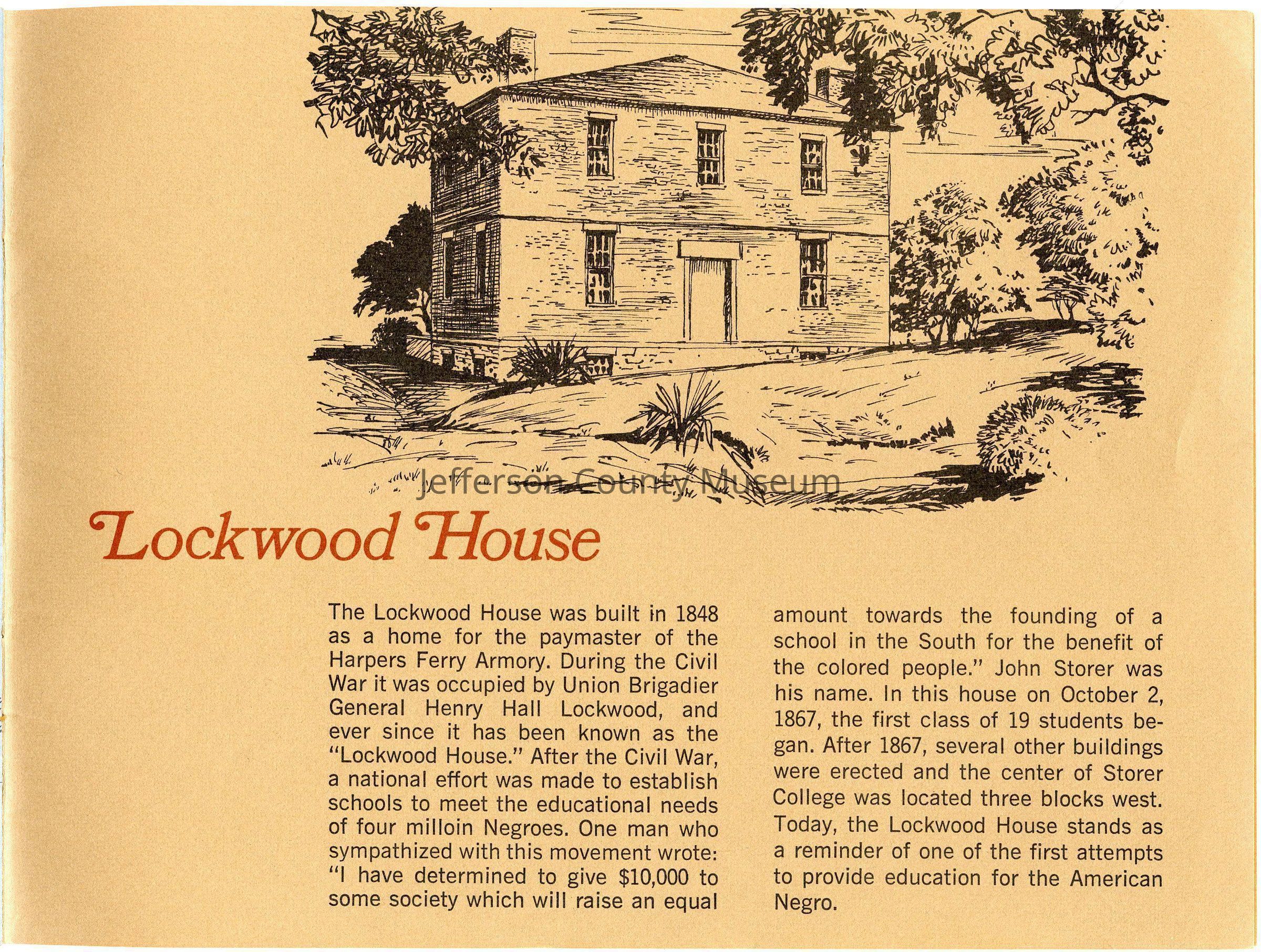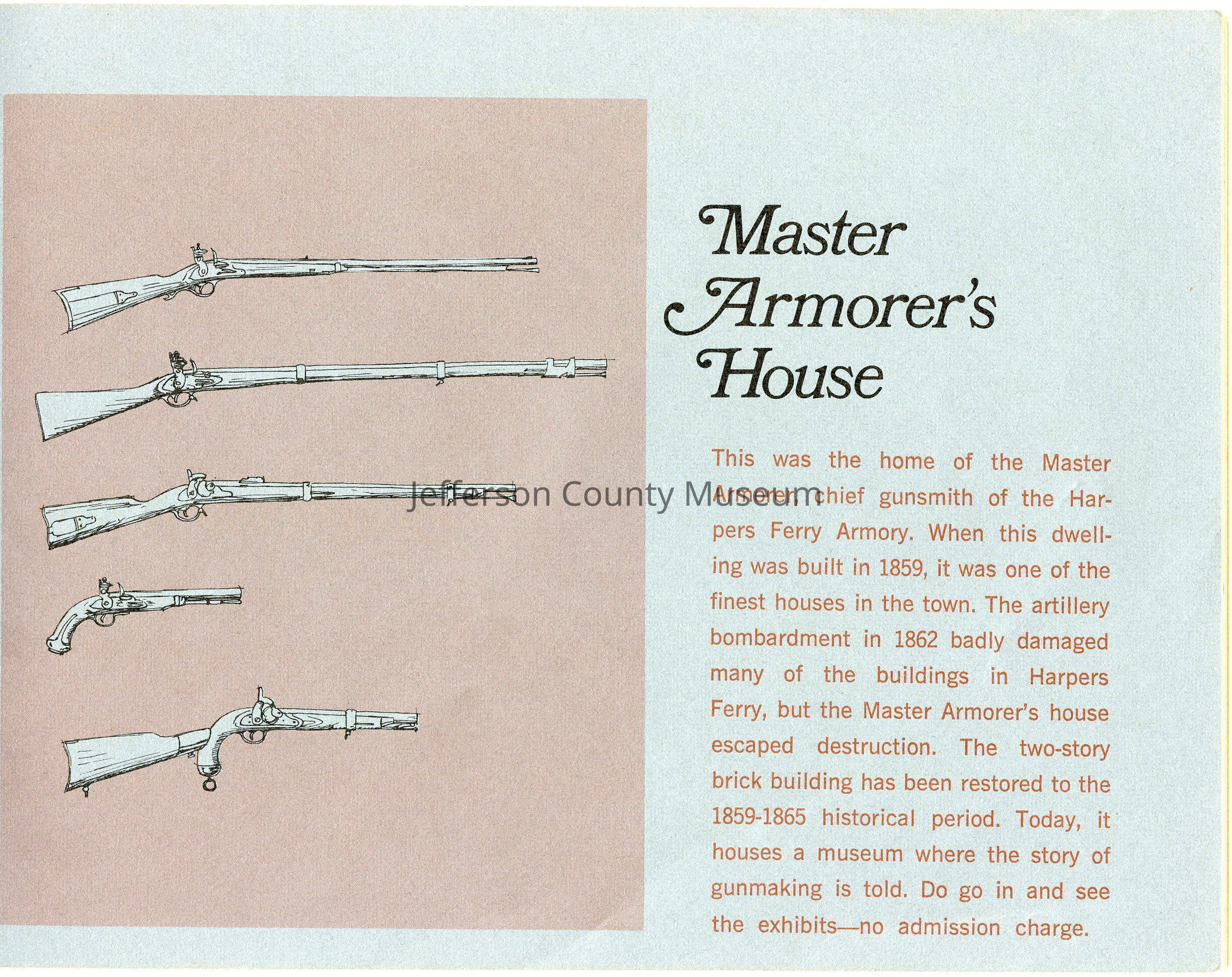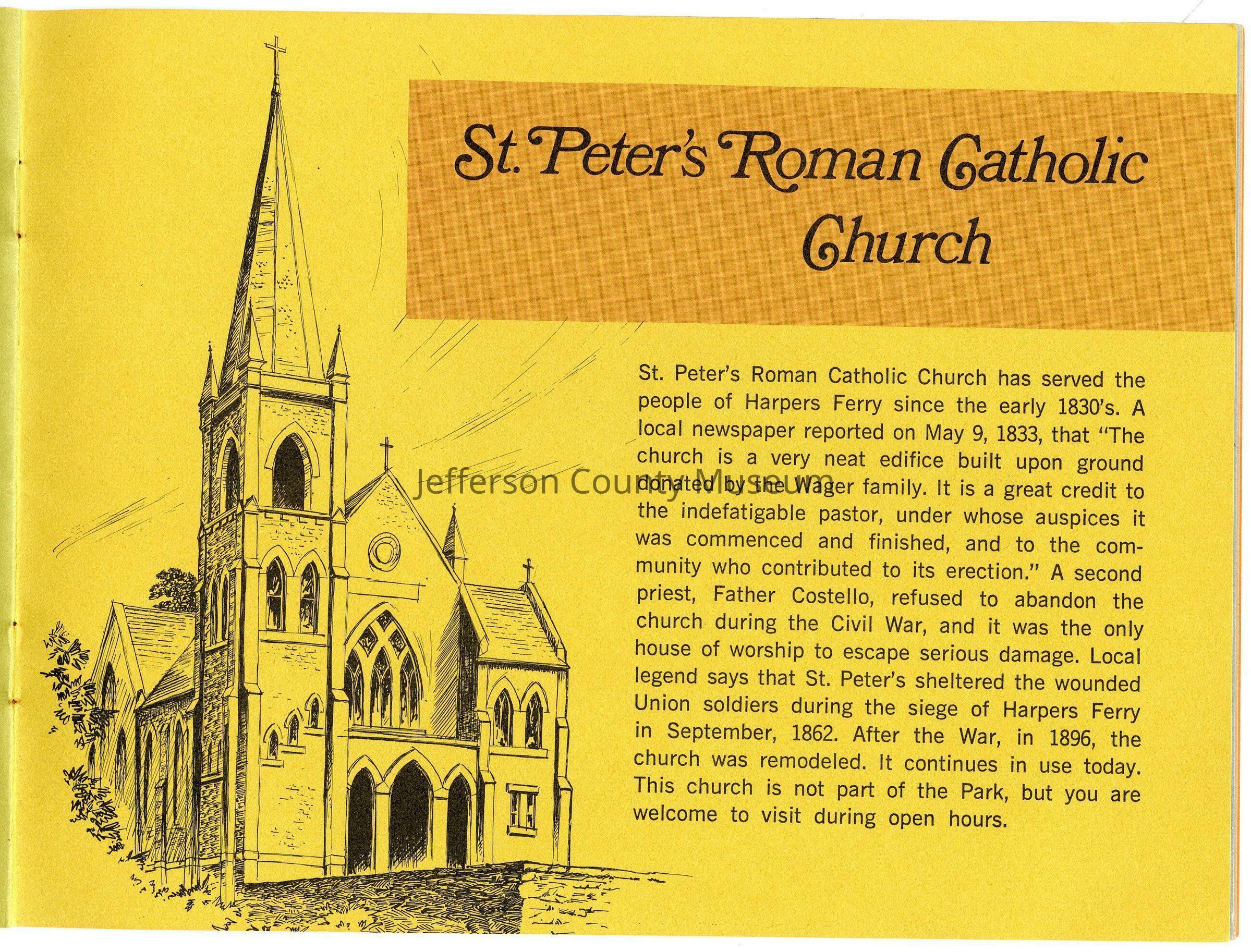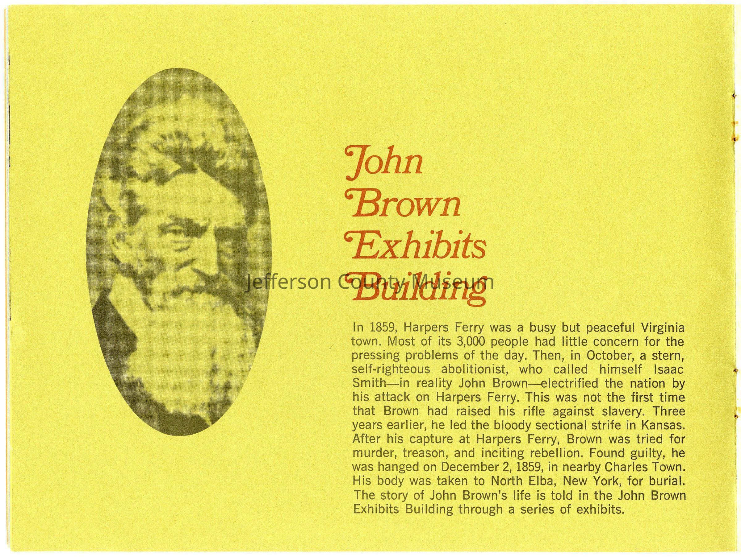 This colorized booklet contains images and brief written histories to supplement a visitor's walking tour throughout Harper's Ferry. The booklet contains items such as maps, hand drawn images, photographs, and text pertaining to a number of places in the area. The booklet was published and distributed by the Harper's Ferry National Park and the National Park Service.