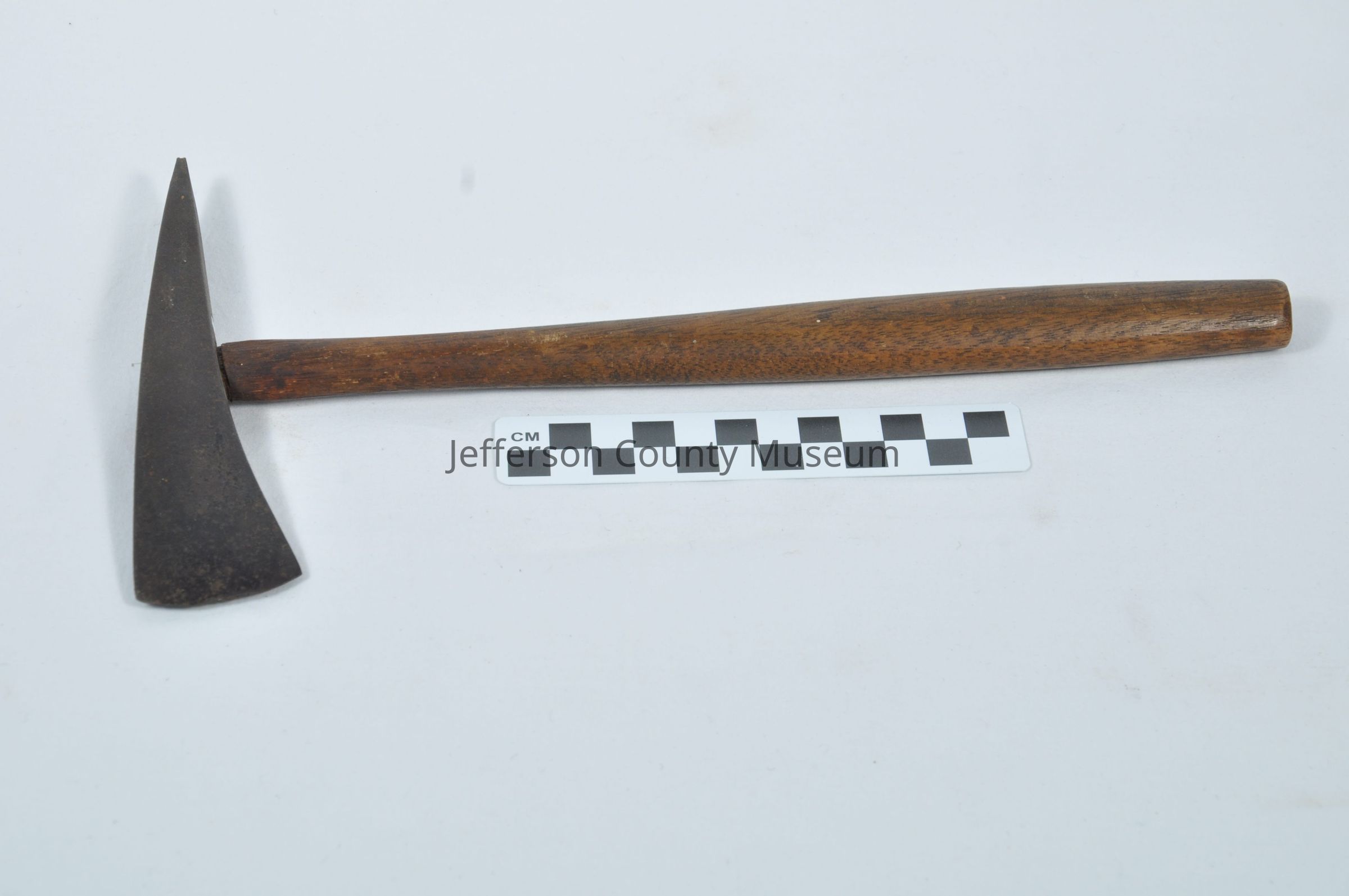 Miner's small pick/hatchet. Letters stamped on the wooden handle may be "J L BURNAP".