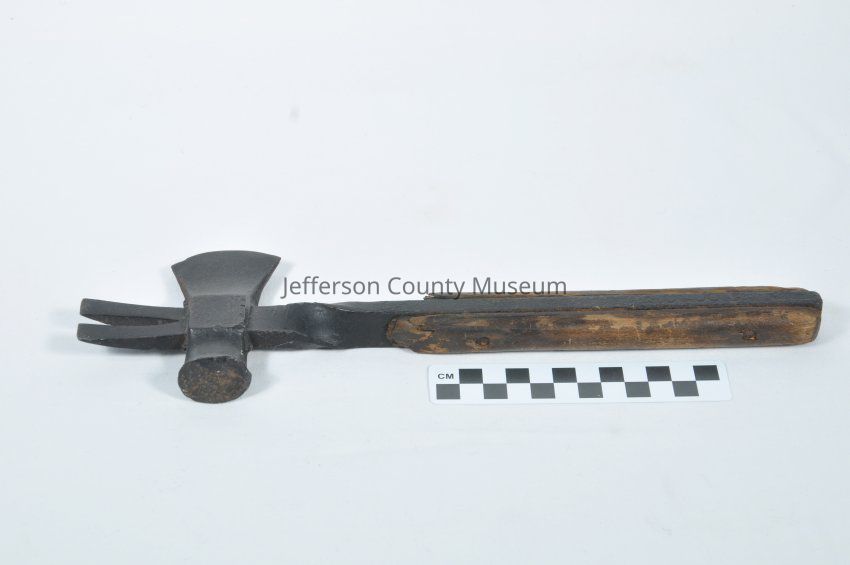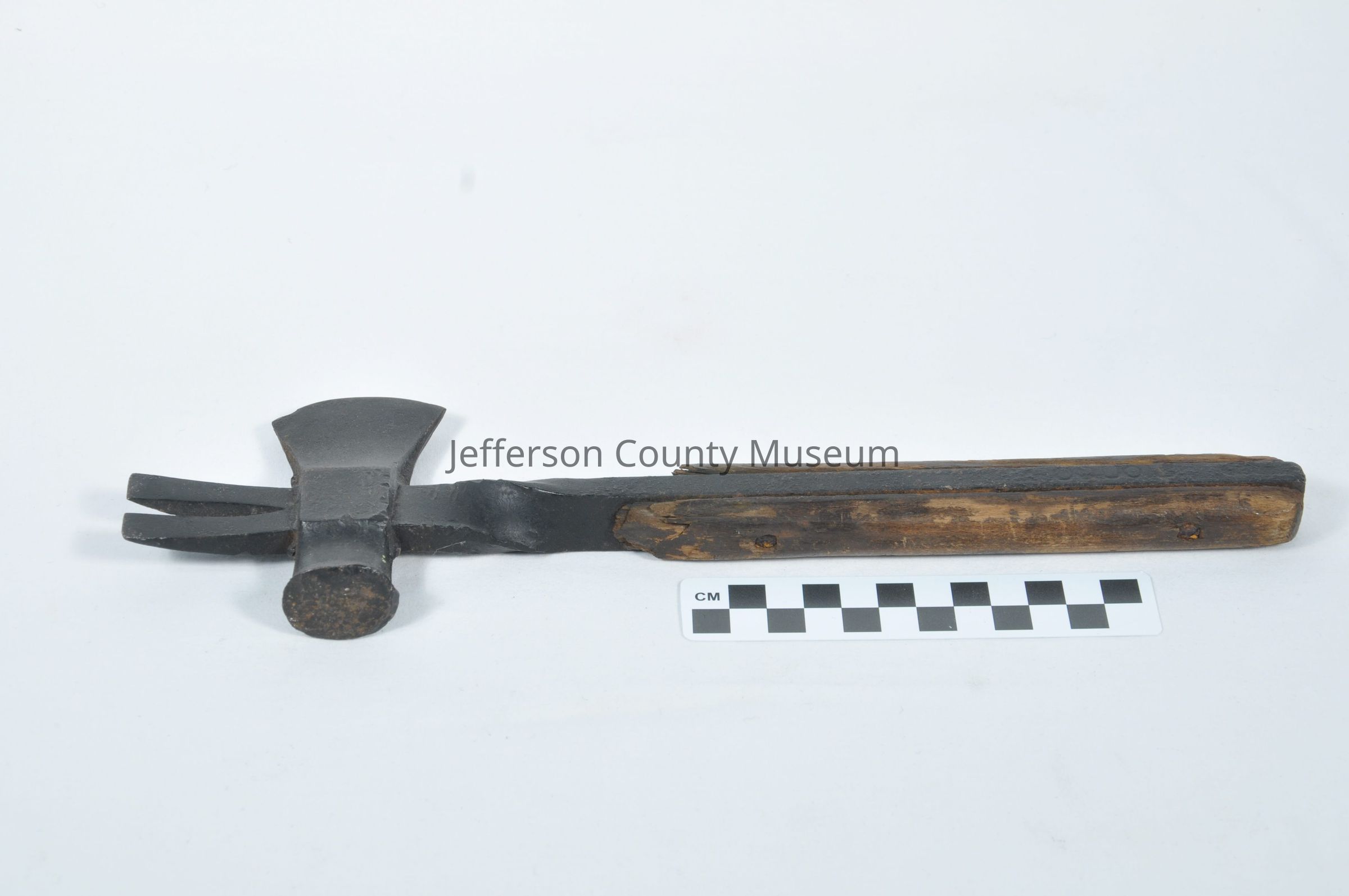 This item has been described as a crate hammer, a shingle hammer, and a general store hammer. It could do all three of those things and more. It is a single metal bar, twisted once near the head. The end of the single piece is a pry bar of nail remover. The hammer and hatchet head is wrapped around this single piece. Wooden handles are attached to the single piece. There are mostly illegible words stamped on both sides of the metal handle. One side reads