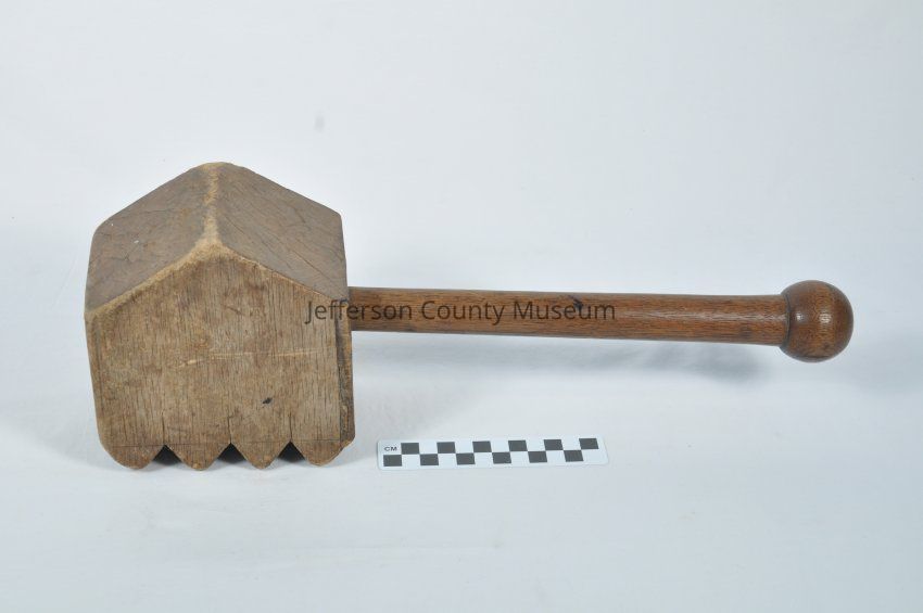 This all wood piece was probably used to mash flax. One side of the head has one edge to break the flax and the other side has four. The handle is a separate piece driven and wedged into the head. The end of the handle is round like a ball.Acquisition