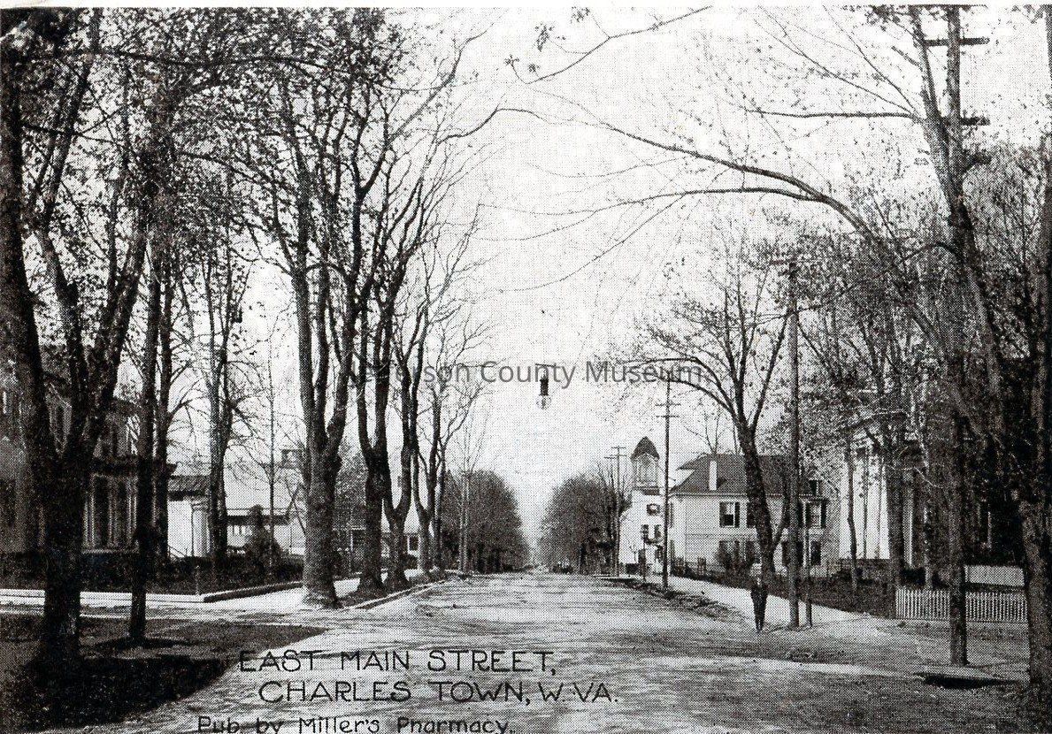 East Main Street, Charles Town, W. Va. Published by Miller's Pharmacy. Mailed in Charlestown, W.VA. in 1909. Shows suspended street light.Acquisition