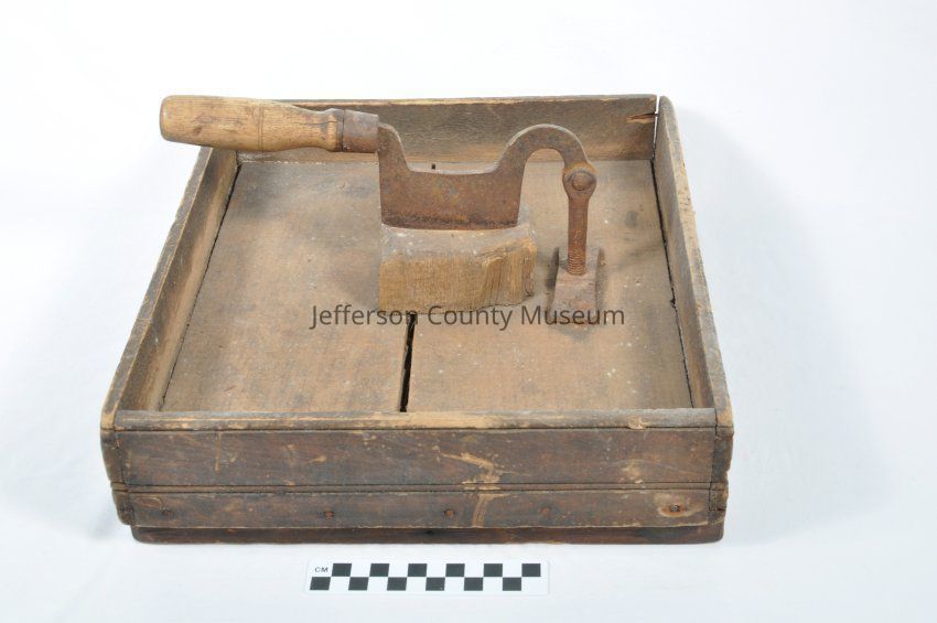 Small chopping knife mounted in a wooden box with a wooden block. Wooden handle. Probably used for cutting cigars, and plug tobacco.Acquisition