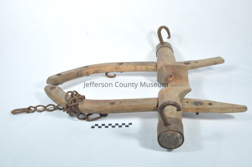 Wood and iron yoke for horse or mule. Has large wooden hames, a chain attached to bottom of hames and large iron hooks at each end of yoke. Ring attached to one side of yoke.Acquisition
