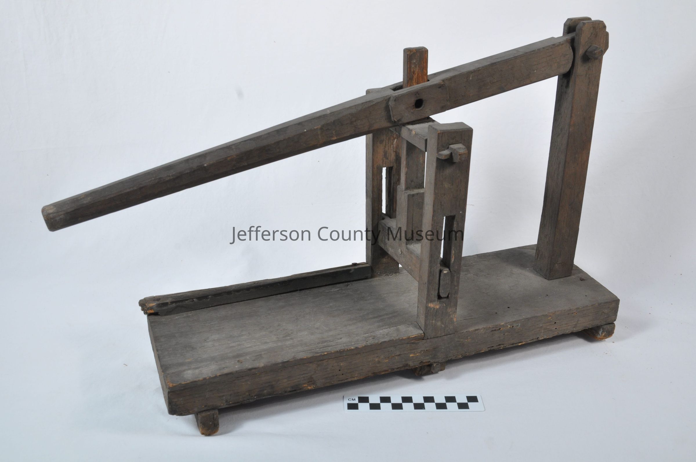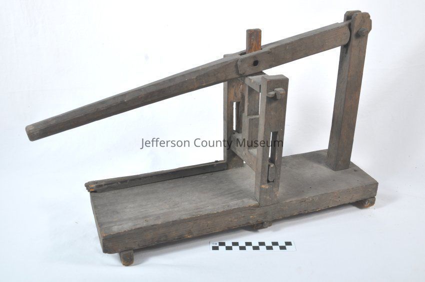 Wooden object may have been some type of press for tobacco or other kind of material. Wooden press part goes within about one and a half inches from bottom and is stopped there. Has long lever handle to push press down. Missing peg connecting lever and press.Acquisition