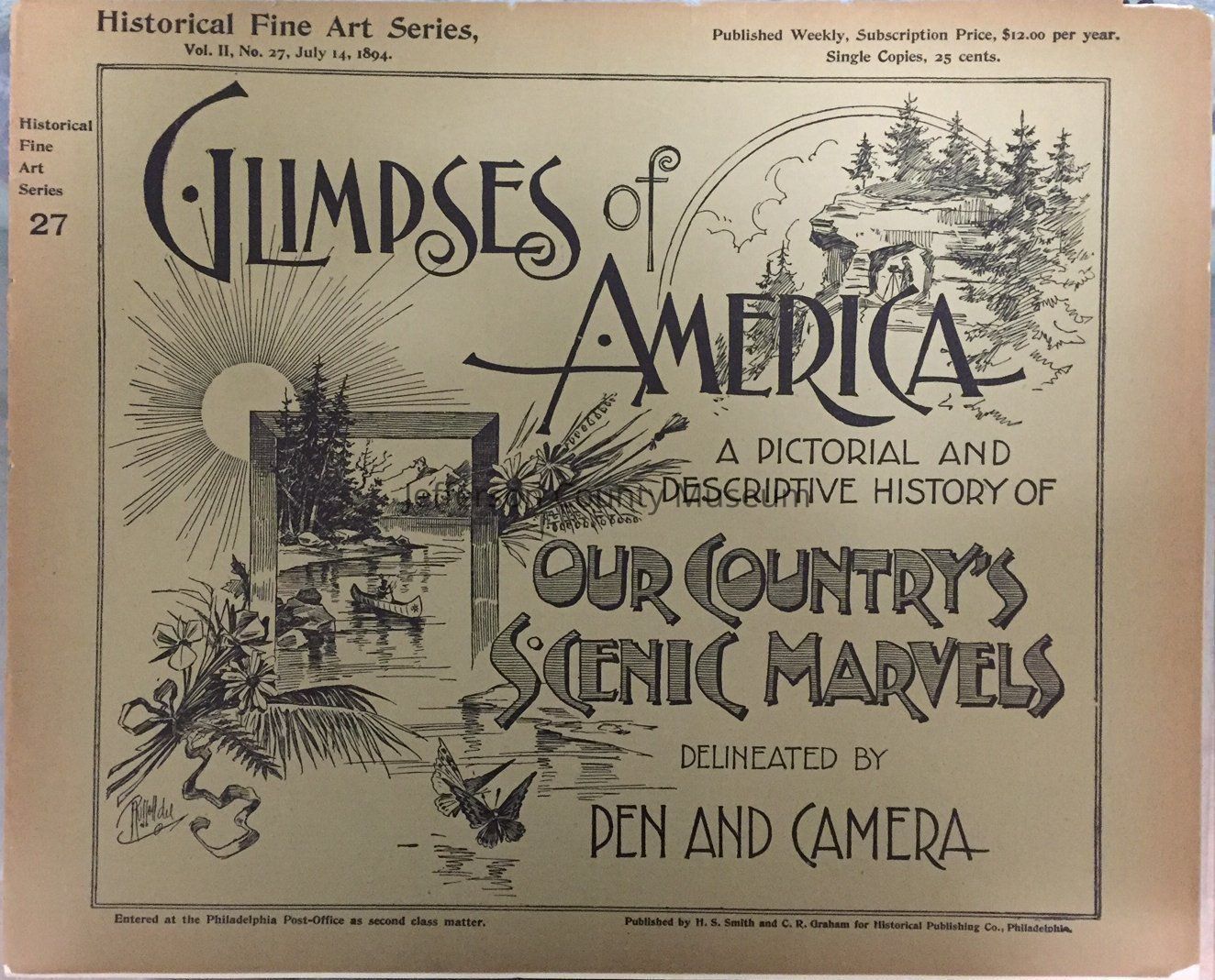 A printed publication of the weekly edition of "Glimpses of America: a Pictorial and Descriptive History of our Country's Scenic Marvels, Delineated by Pen and Camera". Both informative text and black and white photographs inside. Created by the Historical and Fine Arts Series, Vol. II, no. 27, July 14, 1894.