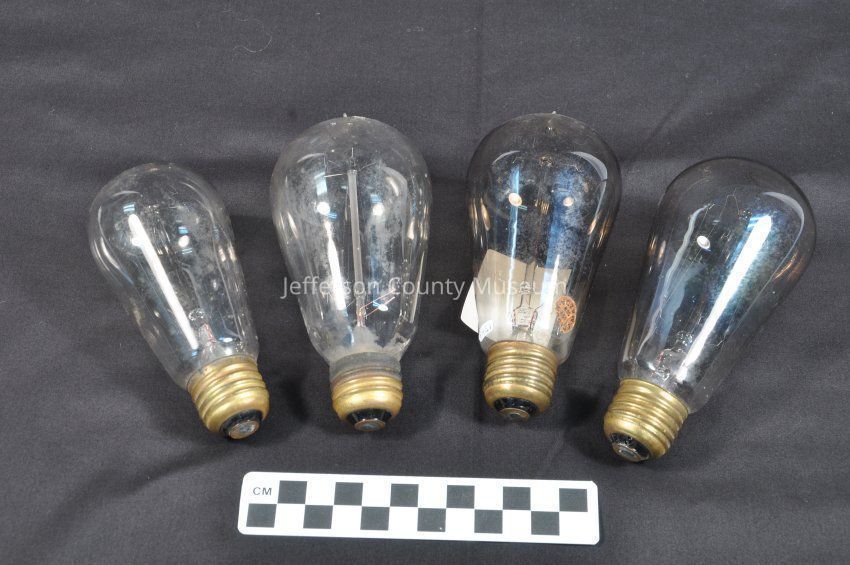 Four late 19th or early 20th century light bulbs. Note taped to one says it does not work and the other three do work. All four are teardrop shaped and two have sharp pointed glass tips. The one that does not work has a round paper label that says "EDISON MAZDA 115V 50W". One has a painted on label that say "LA CO" in a rectangular box. On the opposite side it says "MADE IN HOLLAND". One has a label on the end that says "MAZDA 50W 115V" around the "GE" logo.Acquisition